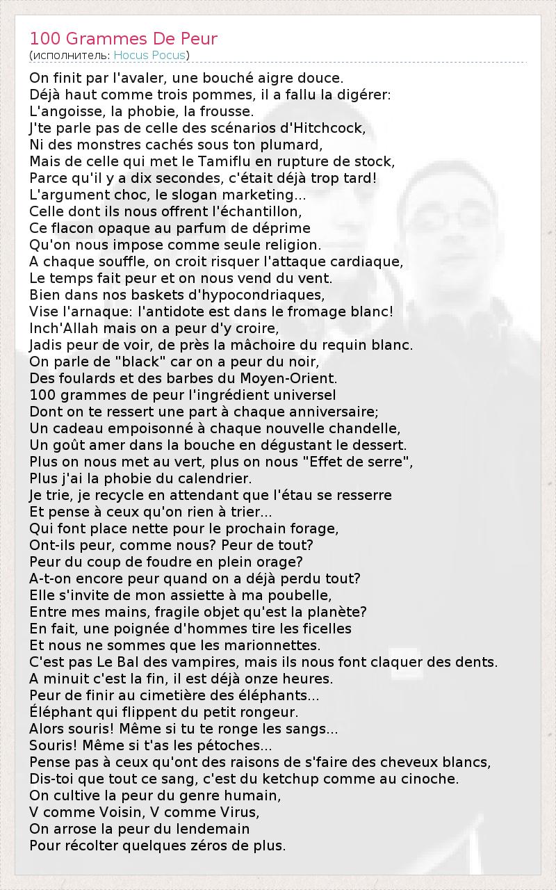 А как ты думаешь, о чем песня "100 Grammes De Peur" ?