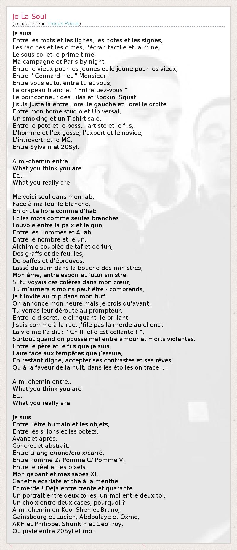 Это интересно:Hocus Pocus- группа из Нанта, в своей музыке они смешивают хип-хоп, джаз и фанк. Эта группа сильно отличается от большей части фр рэпа не только из-за музыки,но и содержания текстов Вансиля.У них есть 4 альбома "Secode Formule", "73 Touches" , "Place 54" и "16 Pieces".