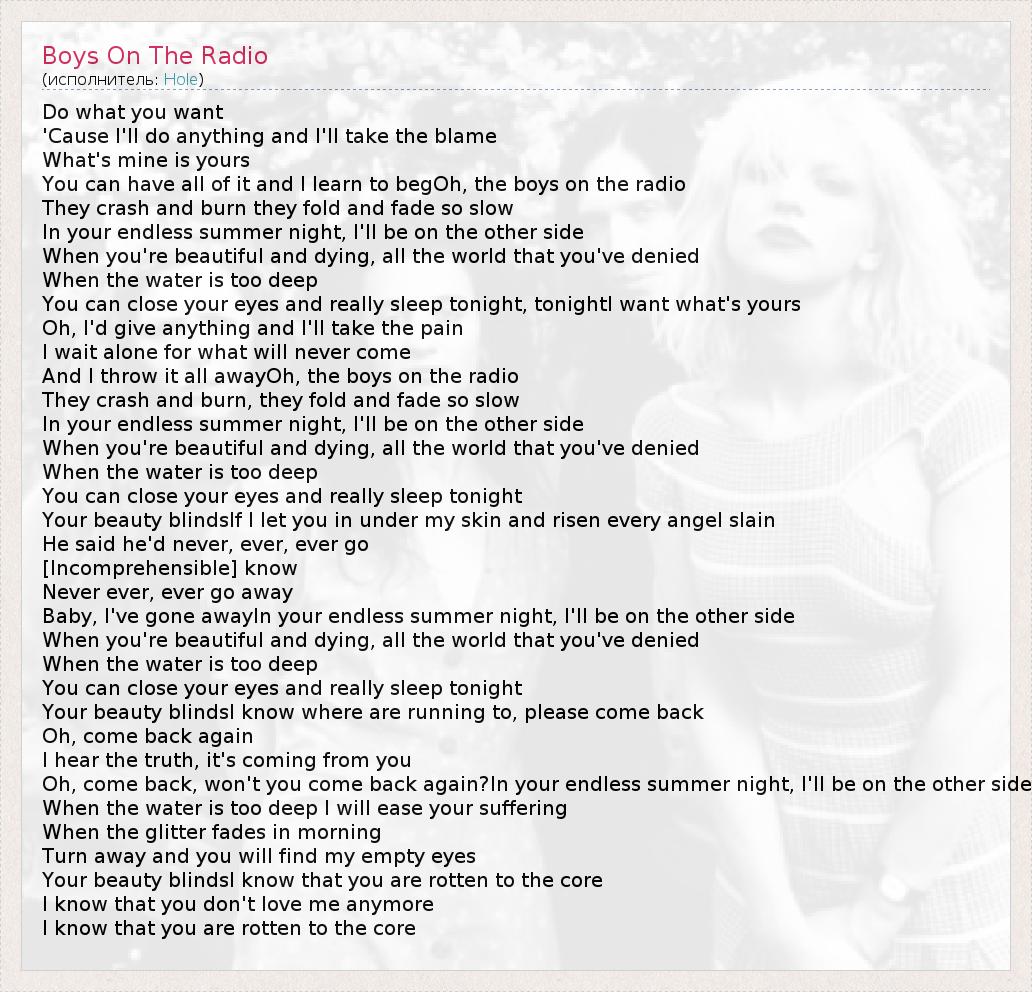 Do what you want 'Cause I'll do anything and I'll take the blame What's mine is yours You can have all of it and I learn to begOh, the boys on the radio They crash and burn they fold and fade so slow In your endless summer night, I'll be on the other side When you're beautiful and dying, all the world that you've denied When the water is too deep You can close your eyes and really sleep tonight, tonightI want what's yours Oh, I'd give anything and I'll take the pain I wait alone for what will never come And I throw it all awayOh, the boys on the radio They crash and burn, they fold and fade so slow In your endless summer night, I'll be on the other side When you're beautiful and dying, all the world that you've denied When the water is too deep You can close your eyes and really sleep tonight Your beauty blindsIf I let you in under my skin and risen every angel slain He said he'd never, ever, ever go [Incomprehensible] know Never ever, ever go away Baby, I've gone awayIn your endless summer night, I'll be on the other side When you're beautiful and dying, all the world that you've denied When the water is too deep You can close your eyes and really sleep tonight Your beauty blindsI know where are running to, please come back Oh, come back again I hear the truth, it's coming from you Oh, come back, won't you come back again?In your endless summer night, I'll be on the other side When the water is too deep I will ease your suffering When the glitter fades in morning Turn away and you will find my empty eyes Your beauty blindsI know that you are rotten to the core I know that you don't love me anymore I know that you are rotten to the core
