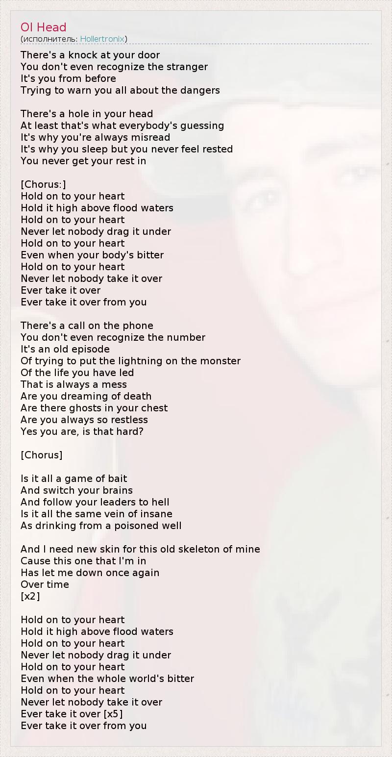 There's a knock at your door You don't even recognize the stranger It's you from before Trying to warn you all about the dangers There's a hole in your head At least that's what everybody's guessing It's why you're always misread It's why you sleep but you never feel rested You never get your rest in [Chorus:] Hold on to your heart Hold it high above flood waters Hold on to your heart Never let nobody drag it under Hold on to your heart Even when your body's bitter Hold on to your heart Never let nobody take it over Ever take it over Ever take it over from you There's a call on the phone You don't even recognize the number It's an old episode Of trying to put the lightning on the monster Of the life you have led That is always a mess Are you dreaming of death Are there ghosts in your chest Are you always so restless Yes you are, is that hard? [Chorus] Is it all a game of bait And switch your brains And follow your leaders to hell Is it all the same vein of insane As drinking from a poisoned well And I need new skin for this old skeleton of mine Cause this one that I'm in Has let me down once again Over time [x2] Hold on to your heart Hold it high above flood waters Hold on to your heart Never let nobody drag it under Hold on to your heart Even when the whole world's bitter Hold on to your heart Never let nobody take it over Ever take it over [x5] Ever take it over from you