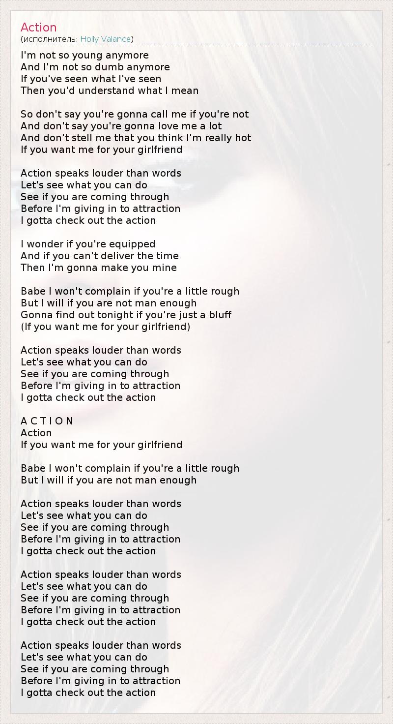 Это интересно:Полное имя: Холли Рэйчел Вукадинович. Холли родилась 11 мая 1983 года, место рождения: Мельбурн, Виктория, Австралия. Родители: отец - Раджко Вукадинович (по национальности - Югослав) и мать Рэйчел (по национальности - Британка). Холли Вэлэнс родилась в семье обладающей огромными талантами и пристрастиями к музыке. Ее отец является модельером по профессии, а так же опытным джазовым гитаристом... продолжение