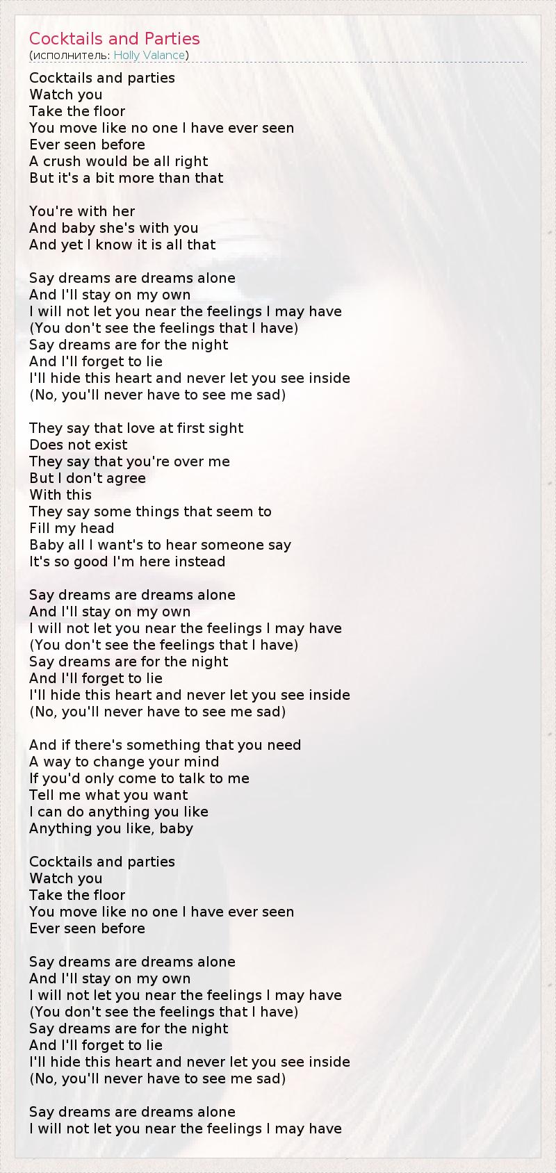 Cocktails and parties Watch you Take the floor You move like no one I have ever seen Ever seen before A crush would be all right But it's a bit more than that You're with her And baby she's with you And yet I know it is all that Say dreams are dreams alone And I'll stay on my own I will not let you near the feelings I may have (You don't see the feelings that I have) Say dreams are for the night And I'll forget to lie I'll hide this heart and never let you see inside (No, you'll never have to see me sad) They say that love at first sight Does not exist They say that you're over me But I don't agree With this They say some things that seem to Fill my head Baby all I want's to hear someone say It's so good I'm here instead Say dreams are dreams alone And I'll stay on my own I will not let you near the feelings I may have (You don't see the feelings that I have) Say dreams are for the night And I'll forget to lie I'll hide this heart and never let you see inside (No, you'll never have to see me sad) And if there's something that you need A way to change your mind If you'd only come to talk to me Tell me what you want I can do anything you like Anything you like, baby Cocktails and parties Watch you Take the floor You move like no one I have ever seen Ever seen before Say dreams are dreams alone And I'll stay on my own I will not let you near the feelings I may have (You don't see the feelings that I have) Say dreams are for the night And I'll forget to lie I'll hide this heart and never let you see inside (No, you'll never have to see me sad) Say dreams are dreams alone I will not let you near the feelings I may have