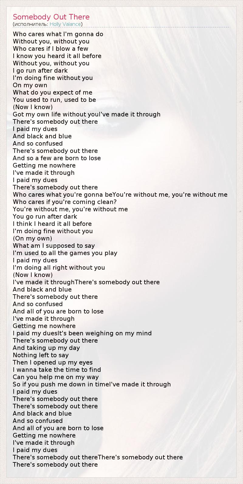 Who cares what I'm gonna do Without you, without you Who cares if I blow a few I know you heard it all before Without you, without you I go run after dark I'm doing fine without you On my own What do you expect of me You used to run, used to be (Now I know) Got my own life without youI've made it through There's somebody out there I paid my dues And black and blue And so confused There's somebody out there And so a few are born to lose Getting me nowhere I've made it through I paid my dues There's somebody out there Who cares what you're gonna beYou're without me, you're without me Who cares if you're coming clean? You're without me, you're without me You go run after dark I think I heard it all before I'm doing fine without you (On my own) What am I supposed to say I'm used to all the games you play I paid my dues I'm doing all right without you (Now I know) I've made it throughThere's somebody out there And black and blue There's somebody out there And so confused And all of you are born to lose I've made it through Getting me nowhere I paid my duesIt's been weighing on my mind There's somebody out there And taking up my day Nothing left to say Then I opened up my eyes I wanna take the time to find Can you help me on my way So if you push me down in timeI've made it through I paid my dues There's somebody out there There's somebody out there And black and blue And so confused And all of you are born to lose Getting me nowhere I've made it through I paid my dues There's somebody out thereThere's somebody out there There's somebody out there