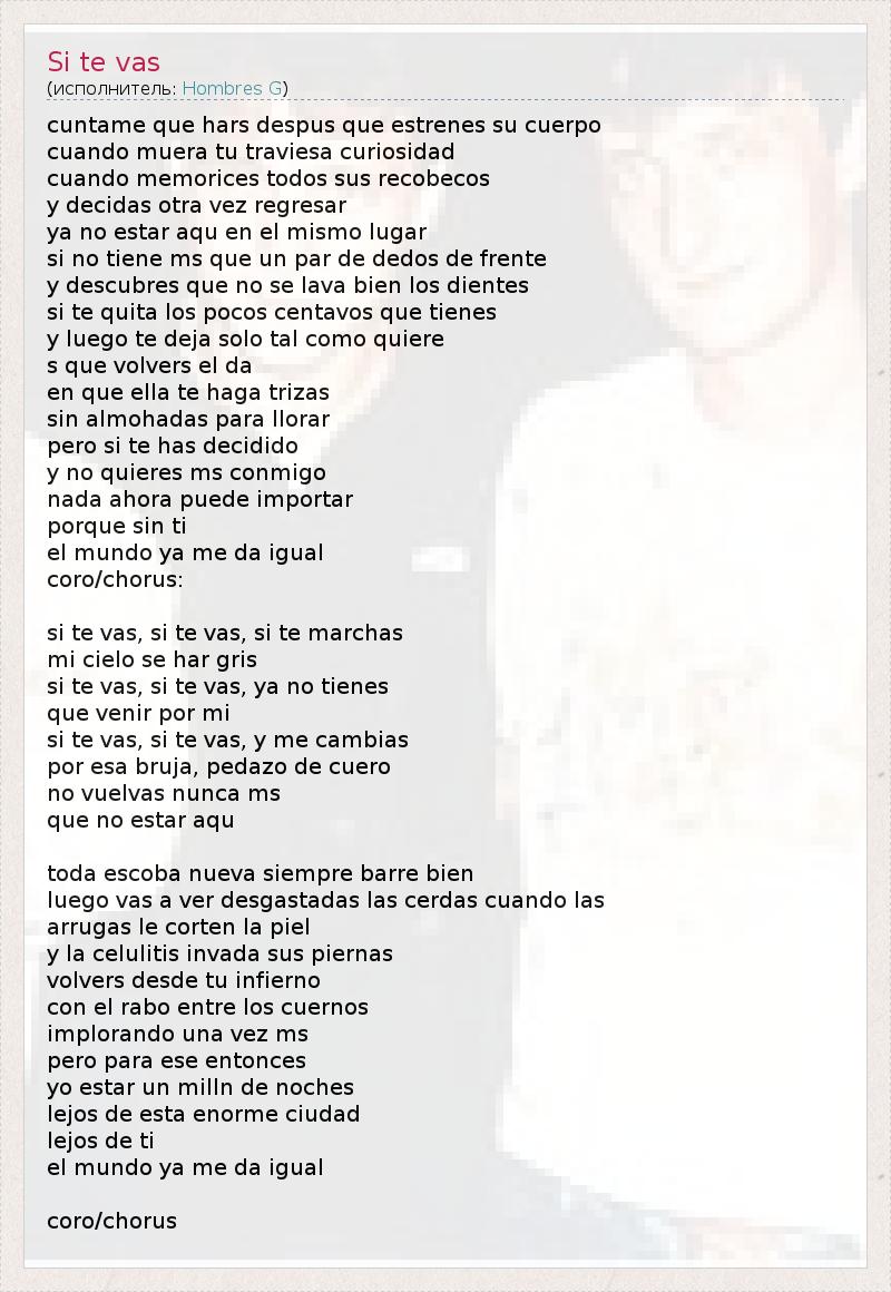 cuntame que hars despus que estrenes su cuerpo cuando muera tu traviesa curiosidad cuando memorices todos sus recobecos y decidas otra vez regresar ya no estar aqu en el mismo lugar si no tiene ms que un par de dedos de frente y descubres que no se lava bien los dientes si te quita los pocos centavos que tienes y luego te deja solo tal como quiere s que volvers el da en que ella te haga trizas sin almohadas para llorar pero si te has decidido y no quieres ms conmigo nada ahora puede importar porque sin ti el mundo ya me da igual coro/chorus: si te vas, si te vas, si te marchas mi cielo se har gris si te vas, si te vas, ya no tienes que venir por mi si te vas, si te vas, y me cambias por esa bruja, pedazo de cuero no vuelvas nunca ms que no estar aqu toda escoba nueva siempre barre bien luego vas a ver desgastadas las cerdas cuando las arrugas le corten la piel y la celulitis invada sus piernas volvers desde tu infierno con el rabo entre los cuernos implorando una vez ms pero para ese entonces yo estar un milln de noches lejos de esta enorme ciudad lejos de ti el mundo ya me da igual coro/chorus