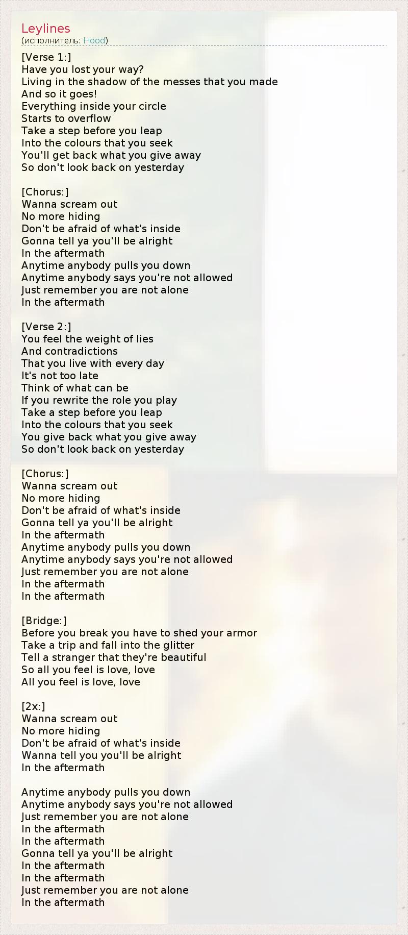 [Verse 1:] Have you lost your way? Living in the shadow of the messes that you made And so it goes! Everything inside your circle Starts to overflow Take a step before you leap Into the colours that you seek You'll get back what you give away So don't look back on yesterday [Chorus:] Wanna scream out No more hiding Don't be afraid of what's inside Gonna tell ya you'll be alright In the aftermath Anytime anybody pulls you down Anytime anybody says you're not allowed Just remember you are not alone In the aftermath [Verse 2:] You feel the weight of lies And contradictions That you live with every day It's not too late Think of what can be If you rewrite the role you play Take a step before you leap Into the colours that you seek You give back what you give away So don't look back on yesterday [Chorus:] Wanna scream out No more hiding Don't be afraid of what's inside Gonna tell ya you'll be alright In the aftermath Anytime anybody pulls you down Anytime anybody says you're not allowed Just remember you are not alone In the aftermath In the aftermath [Bridge:] Before you break you have to shed your armor Take a trip and fall into the glitter Tell a stranger that they're beautiful So all you feel is love, love All you feel is love, love [2x:] Wanna scream out No more hiding Don't be afraid of what's inside Wanna tell you you'll be alright In the aftermath Anytime anybody pulls you down Anytime anybody says you're not allowed Just remember you are not alone In the aftermath In the aftermath Gonna tell ya you'll be alright In the aftermath In the aftermath Just remember you are not alone In the aftermath