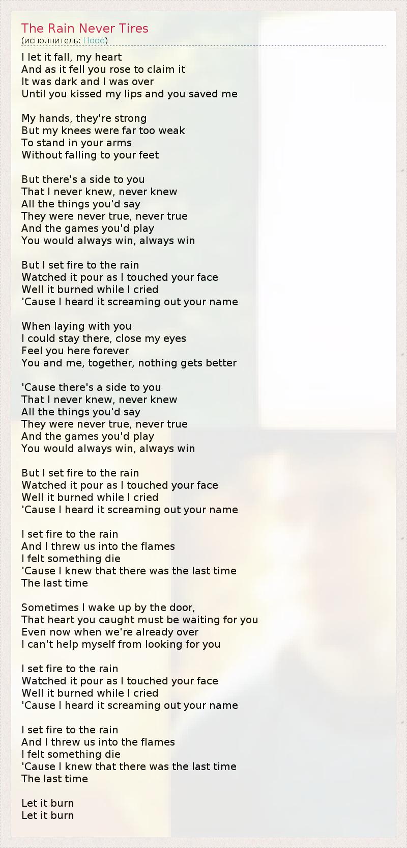 А как ты думаешь, о чем песня "The Rain Never Tires" ?