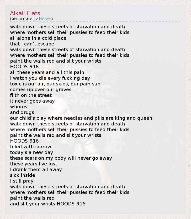 walk down these streets of starvation and death where mothers sell their pussies to feed their kids all alone in a cold place that I can't escape walk down these streets of starvation and death where mothers sell their pussies to feed their kids paint the walls red and slit your wrists HOODS-916 all these years and all this pain I watch you die every fucking day toxic is our air, our skies, our pain sun comes up over our graves filth on the street it never goes away whores and drugs our child's play where needles and pills are king and queen walk down these streets of starvation and death where mothers sell their pussies to feed their kids paint the walls red and slit your wrists HOODS-916 filled with sorrow today's a new day these scars on my body will never go away these years I've lost I drank them all away sick inside I still pray walk down these streets of starvation and death where mothers sell their pussies to feed their kids paint the walls red and slit your wrists-HOODS-916