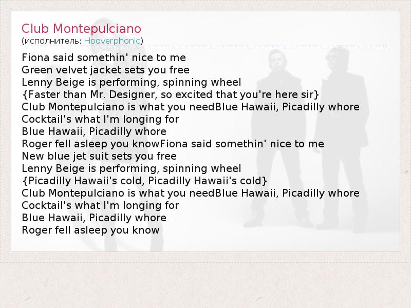 А как ты думаешь, о чем песня "Club Montepulciano" ?