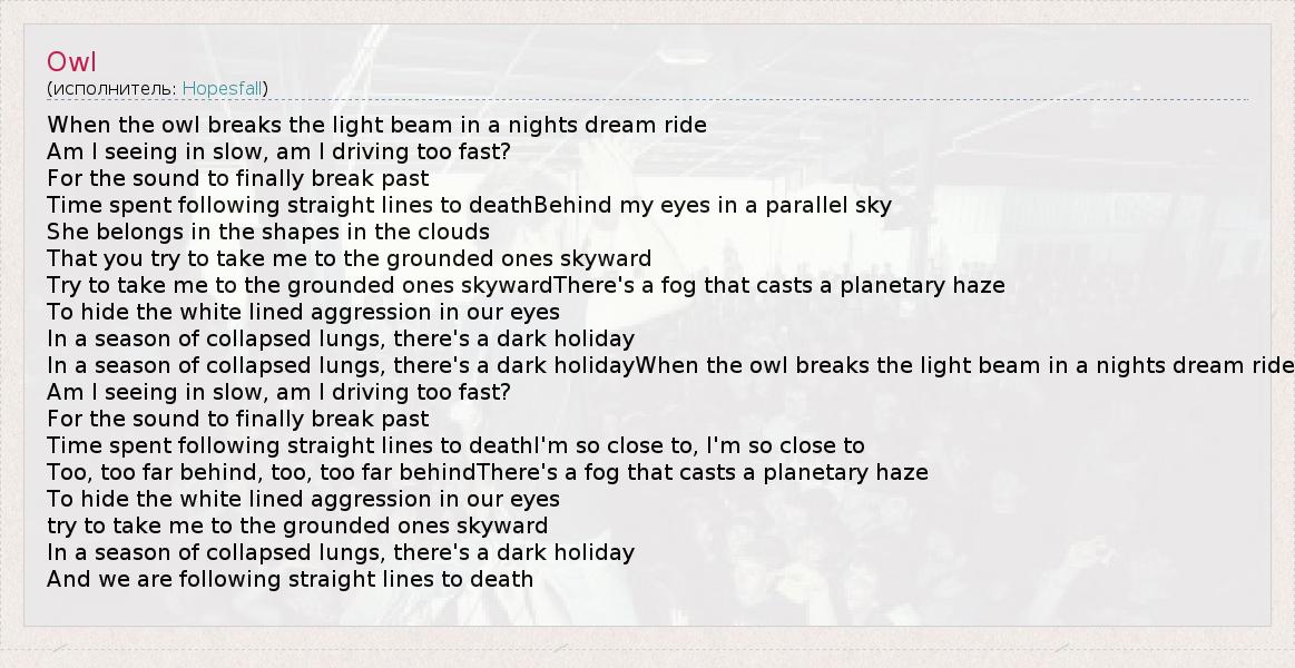 When the owl breaks the light beam in a nights dream ride Am I seeing in slow, am I driving too fast? For the sound to finally break past Time spent following straight lines to deathBehind my eyes in a parallel sky She belongs in the shapes in the clouds That you try to take me to the grounded ones skyward Try to take me to the grounded ones skywardThere's a fog that casts a planetary haze To hide the white lined aggression in our eyes In a season of collapsed lungs, there's a dark holiday In a season of collapsed lungs, there's a dark holidayWhen the owl breaks the light beam in a nights dream ride Am I seeing in slow, am I driving too fast? For the sound to finally break past Time spent following straight lines to deathI'm so close to, I'm so close to Too, too far behind, too, too far behindThere's a fog that casts a planetary haze To hide the white lined aggression in our eyes try to take me to the grounded ones skyward In a season of collapsed lungs, there's a dark holiday And we are following straight lines to death