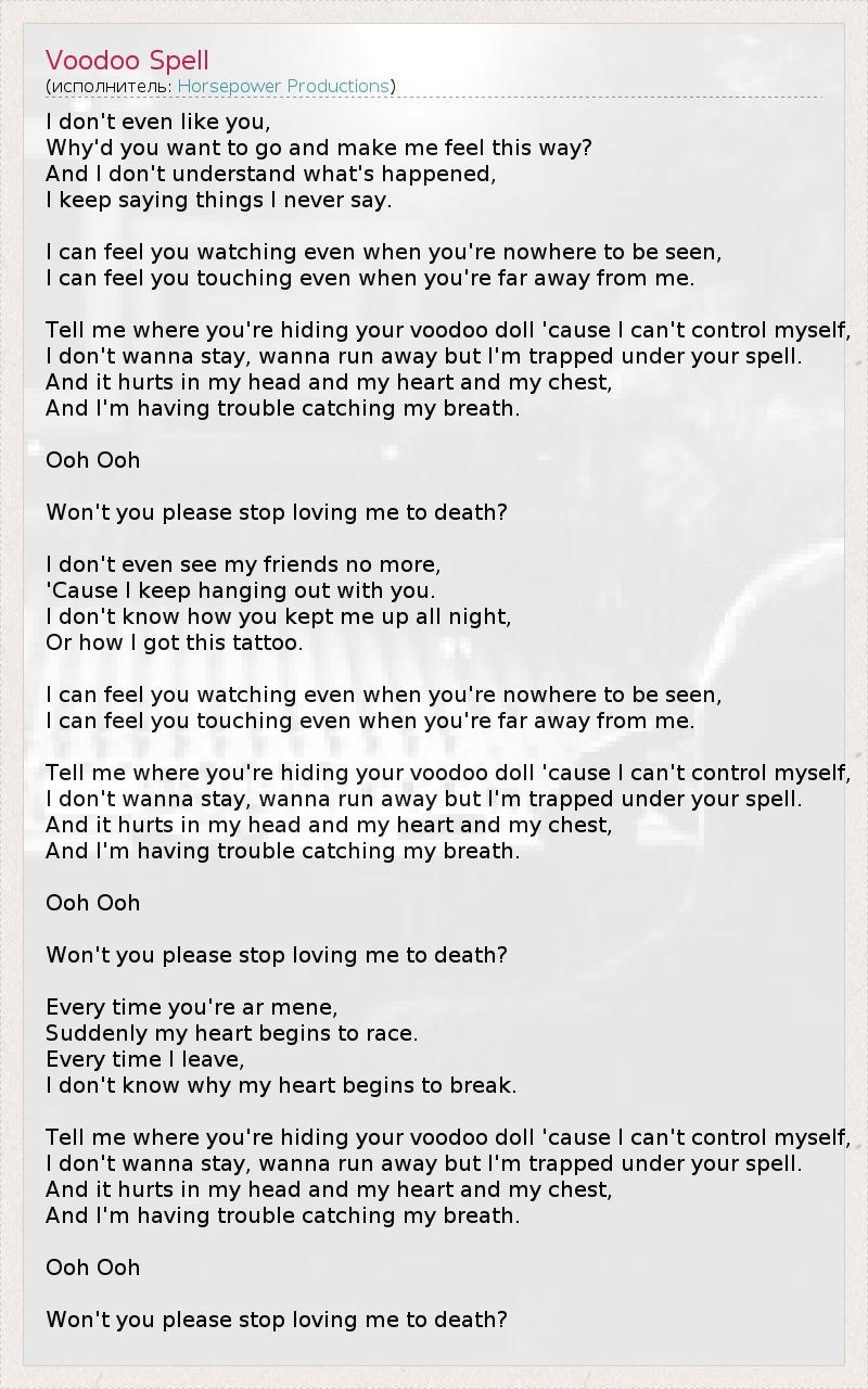 Ты мне даже никогда не нравилась, Так почему ты хочешь и дальше заставлять меня чувствовать это? И я не понимаю, что же происходит, Я продолжаю говорить вещи, которые никогда бы не сказал. Я ощущаю твой взгляд на себе, даже если тебя не видно поблизости. Я чувствую твое прикосновение, даже если ты далеко от меня. Скажи мне, где ты взяла эту куклу вуду, Потому что я не могу себя контролировать. Я больше не хочу оставаться рядом с тобой, я хочу сбежать. Но я попал в ловушку твоих чар. Мне больно, я чувствую боль в голове, сердце, груди. Мне трудно дышать. Оу Оу Могла бы перестать любить меня до смерти? Я даже перестал встречаться со своими друзьями, Потому что все свободное время проводил с тобой. Я не знаю, как ты удерживала меня рядом с собой ночью, Или откуда взялась эта татуировка. Скажи мне, где ты взяла эту куклу вуду, Потому что я не могу себя контролировать. Я больше не хочу оставаться здесь, я хочу сбежать. Но я попал в ловушку твоих чар. Мне больно, я чувствую боль в голове, сердце, груди. Мне трудно дышать. Оу Оу Могла бы перестать любить меня до смерти? Каждый раз, когда ты находишься со мной, Мое сердце начинает биться с бешеной скоростью. Каждый раз, когда я ухожу, Я не понимаю почему, но мое сердце разбивается. Скажи мне, где ты взяла эту куклу вуду, Потому что я не могу себя контролировать. Я больше не хочу оставаться здесь, я хочу сбежать. Но я попал в ловушку твоих чар. Мне больно, я чувствую боль в голове, сердце, груди. Мне трудно дышать. Оу Оу Могла бы перестать любить меня до смерти?