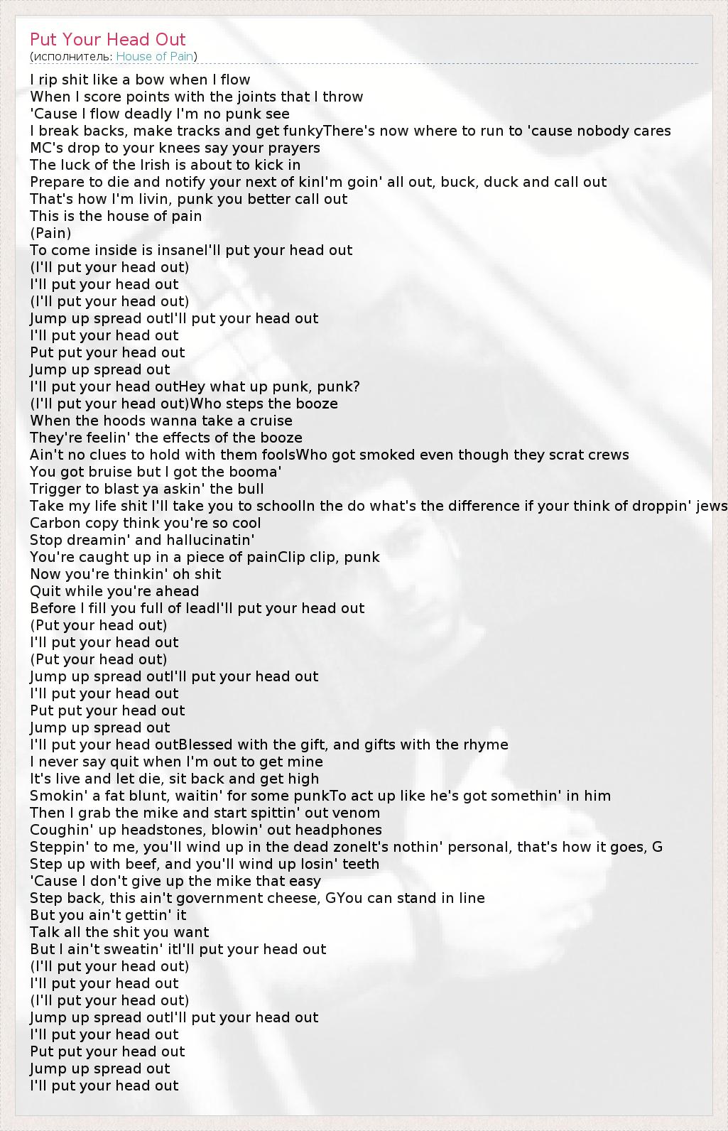 I rip shit like a bow when I flow When I score points with the joints that I throw 'Cause I flow deadly I'm no punk see I break backs, make tracks and get funkyThere's now where to run to 'cause nobody cares MC's drop to your knees say your prayers The luck of the Irish is about to kick in Prepare to die and notify your next of kinI'm goin' all out, buck, duck and call out That's how I'm livin, punk you better call out This is the house of pain (Pain) To come inside is insaneI'll put your head out (I'll put your head out) I'll put your head out (I'll put your head out) Jump up spread outI'll put your head out I'll put your head out Put put your head out Jump up spread out I'll put your head outHey what up punk, punk? (I'll put your head out)Who steps the booze When the hoods wanna take a cruise They're feelin' the effects of the booze Ain't no clues to hold with them foolsWho got smoked even though they scrat crews You got bruise but I got the booma' Trigger to blast ya askin' the bull Take my life shit I'll take you to schoolIn the do what's the difference if your think of droppin' jews Carbon copy think you're so cool Stop dreamin' and hallucinatin' You're caught up in a piece of painClip clip, punk Now you're thinkin' oh shit Quit while you're ahead Before I fill you full of leadI'll put your head out (Put your head out) I'll put your head out (Put your head out) Jump up spread outI'll put your head out I'll put your head out Put put your head out Jump up spread out I'll put your head outBlessed with the gift, and gifts with the rhyme I never say quit when I'm out to get mine It's live and let die, sit back and get high Smokin' a fat blunt, waitin' for some punkTo act up like he's got somethin' in him Then I grab the mike and start spittin' out venom Coughin' up headstones, blowin' out headphones Steppin' to me, you'll wind up in the dead zoneIt's nothin' personal, that's how it goes, G Step up with beef, and you'll wind up losin' teeth 'Cause I don't give up the mike that easy Step back, this ain't government cheese, GYou can stand in line But you ain't gettin' it Talk all the shit you want But I ain't sweatin' itI'll put your head out (I'll put your head out) I'll put your head out (I'll put your head out) Jump up spread outI'll put your head out I'll put your head out Put put your head out Jump up spread out I'll put your head out