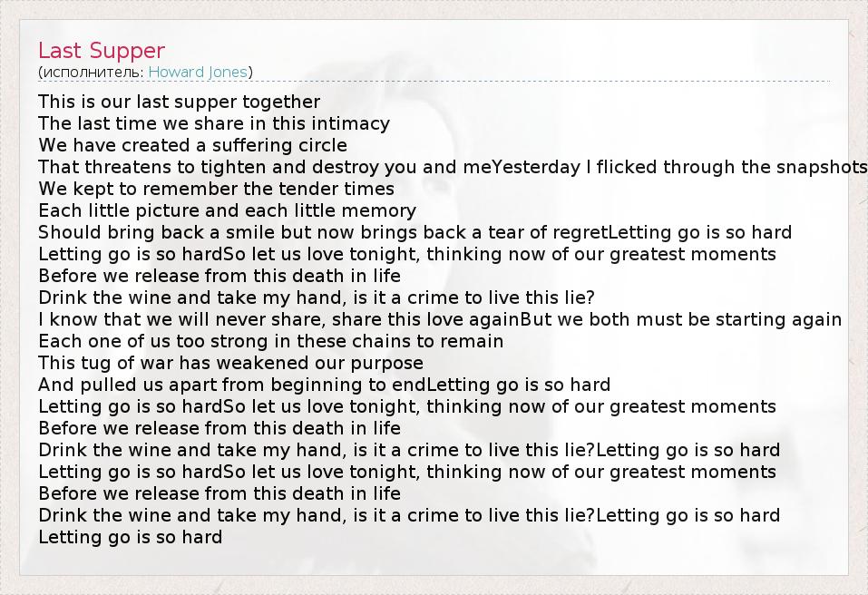 Letting go is so hardSo let us love tonight, thinking now of our greatest moments