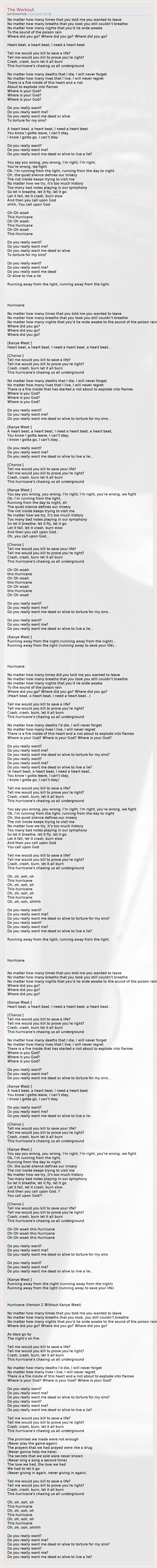 No matter how many times that you told me you wanted to leave No matter how many breaths that you took you still couldn't breathe No matter how many nights that you'd lie wide awake To the sound of the poison rain Where did you go? Where did you go? Where did you go? Heart beat, a heart beat, I need a heart beat Tell me would you kill to save a life? Tell me would you kill to prove you're right? Crash, crash, burn let it all burn This hurricane's chasing us all underground No matter how many deaths that I die, I will never forget No matter how many lives that I live, I will never regret There is a fire inside of this heart and a riot About to explode into flames Where is your God? Where is your God? Where is your God? Do you really want? Do you really want me? Do you really want me dead or alive To torture for my sins? A heart beat, a heart beat, I need a heart beat You know I gotta leave, I can't stay, I know I gotta go, I can't stay Do you really want? Do you really want me? Do you really want me dead or alive to live a lie? You say you wrong, you wrong, I'm right, I'm right, You're wrong, we fight Ok, I'm running from the light, running from the day to night Oh, the quiet silence defines our misery The riot inside keeps trying to visit me No matter how we try, it's too much history Too many bad notes playing in our symphony So let it breathe, let it fly, let it go Let it fall, let it crash, burn slow And then you call upon God ohhh, You call upon God Oh Oh woah This Hurricane Oh Oh woah This Hurricane Oh Oh woah This Hurricane Do you really want? Do you really want me? Do you really want me dead or alive To torture for my sins? Do you really want? Do you really want me? Do you really want me dead Or alive to live a lie Running away from the light, running away from the light. Hurricane No matter how many times that you told me you wanted to leave No matter how many breaths that you took you still couldn't breathe No matter how many nights that you'd lie wide awake to the sound of the poison rain Where did you go? Where did you go? Where did you go? [Kanye West:] Heart beat, a heart beat, I need a heart beat, a heart beat... [Chorus:] Tell me would you kill to save a life? Tell me would you kill to prove you're right? Crash, crash, burn let it all burn This hurricane's chasing us all underground No matter how many deaths that I die, I will never forget No matter how many lives that I live, I will never regret There is a fire inside that has started a riot about to explode into flames Where is you God? Where is you God? Where is you God? Do you really want? Do you really want me? Do you really want me dead or alive to torture for my sins... [Kanye West:] A heart beat, a heart beat, I need a heart beat, a heart beat, You know I gotta leave, I can't stay, I know I gotta go, I can't stay... Do you really want? Do you really want me? Do you really want me dead or alive to live a lie... [Chorus:] Tell me would you kill to save your life? Tell me would you kill to prove you're right? Crash, crash, burn let it all burn This hurricane's chasing us all underground [Kanye West:] You say you wrong, you wrong, I'm right, I'm right, you're wrong, we fight Ok, I'm running from the light, Running from the day to night, oh The quiet silence defines our misery The riot inside keeps trying to visit me No matter how we try, it's too much history Too many bad notes playing in our symphony So let it breathe, let it fly, let it go Let it fall, let it crash, burn slow And then you call upon God... Oh, you call upon God... [Chorus:] Tell me would you kill to save your life? Tell me would you kill to prove you're right? Crash, crash, burn let it all burn This hurricane's chasing us all underground Oh Oh woah this Hurricane Oh Oh woah this Hurricane Oh Oh woah this Hurricane Oh Oh woah Do you really want? Do you really want me? Do you really want me dead or alive to torture for my sins... Do you really want? Do you really want me? Do you really want me dead or alive to live a lie... [Kanye West:] Running away from the night (running away from the night)... Running away from the light (running away to save your life)... Hurricane No matter how many times did you told me you wanted to leave No matter how many breaths that you took you still couldn't breathe No matter how many nights that you'd lie wide awake To the sound of the poison rain Where did you go? Where did you go? Where did you go? (Heart beat, a heart beat, I need a heart beat...) Tell me would you kill to save a life? Tell me would you kill to prove you're right? Crash, crash, burn, let it all burn This hurricane's chasing us all underground No matter how many deaths I'd die, I will never forget No matter how many lives I live, I will never regret There is a fire inside of this heart and a riot about to explode into flames Where is your God? Where is your God? Where is your God? Do you really want? Do you really want me? Do you really want me dead or alive to torture for my sins? Do you really want? Do you really want me? Do you really want me dead or alive to live a lie? (A heart beat, a heart beat, I need a heart beat... You know I gotta leave, I can't stay, I know I gotta go, I can't stay) Tell me would you kill to save a life? Tell me would you kill to prove you're right? Crash, crash, burn, let it all burn This hurricane's chasing us all underground You say you wrong, you wrong, I'm right, I'm right, you're wrong, we fight Ok, I'm running from the light, running from the day to night Oh, the quiet silence defines our misery The riot inside keeps trying to visit me No matter how we try, it's too much history Too many bad notes playing in our symphony So let it breathe, let it fly, let it go Let it fall, let it crash, burn slow And then you call upon God You call upon God Tell me would you kill to save a life? Tell me would you kill to prove you're right? Crash, crash, burn, let it all burn This hurricane's chasing us all underground Oh, oh, ooh, o