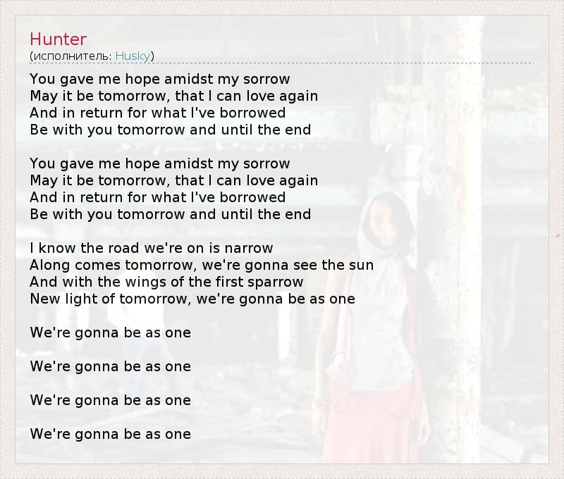 You gave me hope amidst my sorrow May it be tomorrow, that I can love again And in return for what I've borrowed Be with you tomorrow and until the end You gave me hope amidst my sorrow May it be tomorrow, that I can love again And in return for what I've borrowed Be with you tomorrow and until the end I know the road we're on is narrow Along comes tomorrow, we're gonna see the sun And with the wings of the first sparrow New light of tomorrow, we're gonna be as one We're gonna be as one We're gonna be as one We're gonna be as one We're gonna be as one