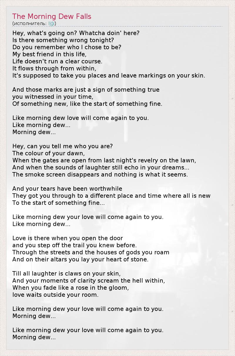 Эй, что происходит? Что ты тут делаешь? Разве сегодня что-то не так? Помнишь ли ты, кем я решил стать? Мой лучший друг, У жизни никогда нет ясного курса. Она исходит изнутри, Cтавит тебя на место и оставляет на коже отметины. Они - знак истин, Которые ты в своё время лицезрел, Знак чего-то нового, знак начала чего-то светлого. Словно утренняя роса, твоя любовь придёт к тебе вновь. Словно утренняя роса... Утренняя роса... Эй, можешь сказать мне, кто ты? Каков цвет твоего рассвета, Когда барьеры сняты вчерашней ночной гульбой на лужайке, А звуки смеха ещё отдаются эхом в твоих снах... Поволока дыма исчезает и ничто уже не остаётся прежним... И твои слёзы были не напрасны, Они пронесли тебя в другое место и время, где всё ново, Где начинается что-то светлое... Словно утренняя роса, твоя любовь придёт к тебе вновь. Как утренняя роса... Любовь будет там, гды ты откроешь дверь И свернёшь с известной тебе тропы. Пройдёшь улицами и домами богов И положишь на их алтарь своё каменное сердце. Когда смех скребёт тебе по коже, И моменты ясности кричат в тебе адским криком, Когда ты увядаешь, словно роза во мраке, Любовь ждёт за дверью. Словно утренняя роса, твоя любовь придёт к тебе вновь. Утренняя роса... Словно утренняя роса, твоя любовь придёт к тебе вновь. Утренняя роса...