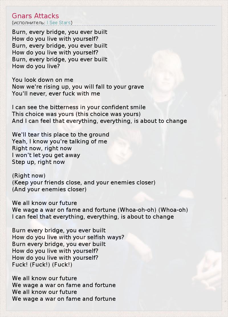Burn, каждый мост, вы когда-либо построенных Как вы живете с самим собой ? Burn, каждый мост, вы когда-либо построенных Как вы живете с самим собой ? Burn, каждый мост, вы когда-либо построенных Как вы живете? Ты смотришь на меня Теперь мы поднимается , вы попадете в могилу Вы никогда не будете , когда-нибудь трахал со мной Я вижу, горечь в вашем уверенной улыбкой Этот выбор был ваш ( этот выбор был ваш ) И я чувствую , что все, все, вот-вот изменится Мы будем рвать это место с землей Да, я знаю, что ты говоришь обо мне Прямо сейчас, прямо сейчас Я не позволю тебе уйти Шаг вверх , прямо сейчас ( Сейчас ) ( Держи своих друзей близко , а врагов еще ближе ) ( И врагов еще ближе ) Мы все знаем, наше будущее Мы вести войну на славе и богатству ( Эй -о-о ) ( Эй -о ) Я чувствую , что все, все, вот-вот изменится Запись каждый мост, вы когда-либо построенных Как вы живете со своими корыстными способами ? Запись каждый мост, вы когда-либо построенных Как вы живете с самим собой ? Как вы живете с самим собой ? Черт! ( Fuck! ) ( Fuck! ) Мы все знаем, наше будущее Мы вести войну на славе и богатству Мы все знаем, наше будущее Мы вести войну на славе и богатству