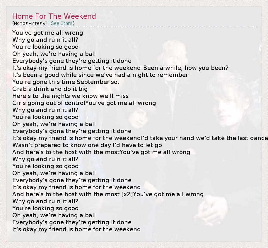 You've got me all wrong Why go and ruin it all? You're looking so good Oh yeah, we're having a ball Everybody's gone they're getting it done It's okay my friend is home for the weekend!Been a while, how you been? It's been a good while since we've had a night to remember You're gone this time September so, Grab a drink and do it big Here's to the nights we know we'll miss Girls going out of controlYou've got me all wrong Why go and ruin it all? You're looking so good Oh yeah, we're having a ball Everybody's gone they're getting it done It's okay my friend is home for the weekendI'd take your hand we'd take the last dance Wasn't prepared to know one day I'd have to let go And here's to the host with the mostYou've got me all wrong Why go and ruin it all? You're looking so good Oh yeah, we're having a ball Everybody's gone they're getting it done It's okay my friend is home for the weekend And here's to the host with the most [x2]You've got me all wrong Why go and ruin it all? You're looking so good Oh yeah, we're having a ball Everybody's gone they're getting it done It's okay my friend is home for the weekend