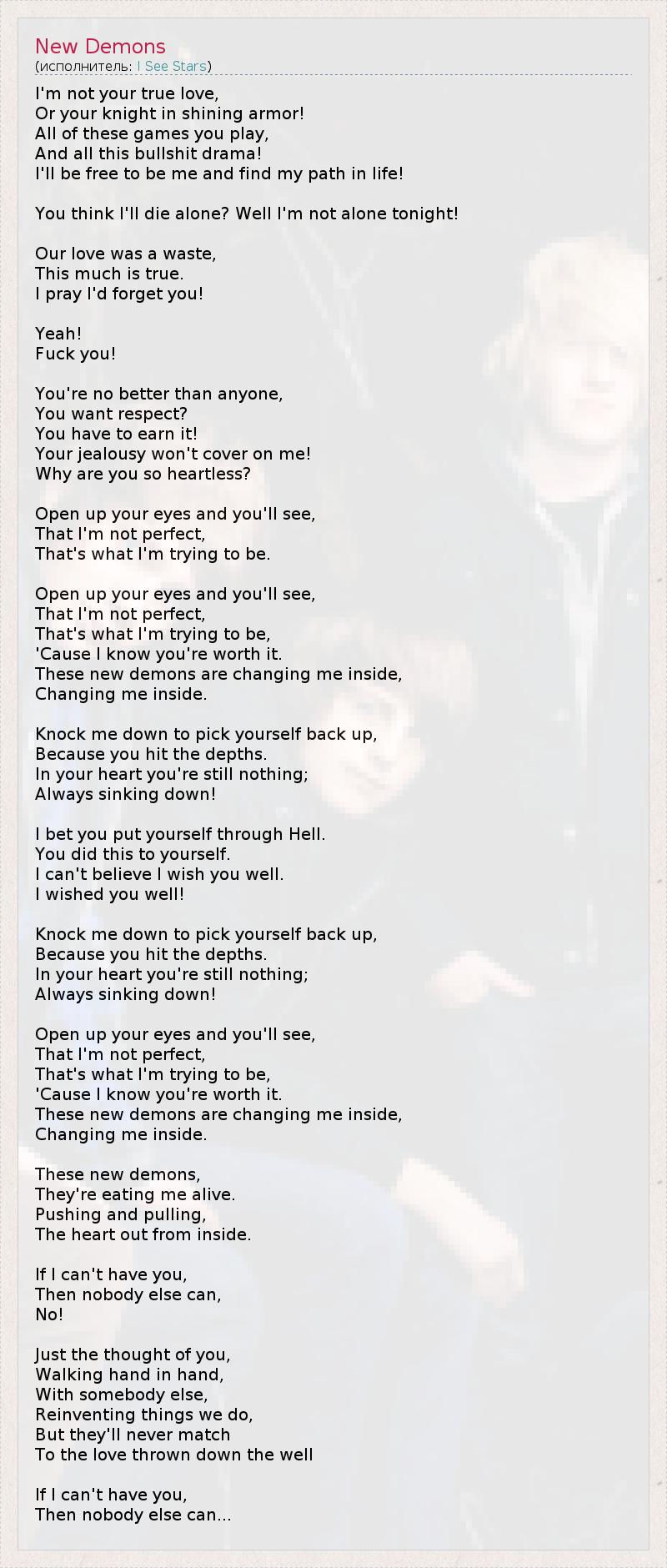 Я не твоя истинная любовь Или рыцарь в сияющих доспехах! Ты играешь во все эти игры, И всё это - ху*вая драма! Я освобожусь, чтобы быть собой, и найду свой путь в жизни! Думаешь, я умру в одиночестве? Сегодня я не одинок! Наша любовь была бесполезной тратой времени. Это истинная правда. Я молюсь, чтоб забыть тебя! Да! Пошла на*уй! Ты такая же, как и все, Хочешь уважения? Ты должна его заработать! Твоя ревность не скажется на мне! Почему ты так бессердечна? Открой глаза, и ты увидишь, Что я не идеален - Это то, кем я пытаюсь быть. Открой глаза, и ты увидишь, Что я не идеален - Это то, кем я пытаюсь быть, Потому что я знаю, что ты заслуживаешь это. Эти новые демоны меняются внутри меня, Меняются внутри меня. Избей меня, чтобы выбраться наружу, Ведь ты на глубине. В твоем сердце все еще ничего нет... Всегда тонешь! Держу пари, ты прошла через ад. Ты сделала это ради себя. Не могу поверить, я желаю тебе всего хорошего. Желаю всего хорошего! Избей меня, чтобы выбраться наружу, Ведь ты на глубине. В твоем сердце все еще ничего нет... Всегда тонешь! Открой глаза, и ты увидишь, Что я не идеален - Это то, кем я пытаюсь быть, Потому что я знаю, что ты заслуживаешь это. Эти новые демоны меняются внутри меня, Меняются внутри меня. Эти новые демоны, Они съедают меня живьём, Выманивая Сердце изнутри. Если у меня нет тебя, Тогда не будет ни у кого, Нет! Лишь мысль о том, что ты Гуляешь за руку С кем-то другим, Обновляет всё, что мы сделали. Но [эта любовь] никогда не будет похожей На любовь, выброшенную в колодец. Если у меня нет тебя, Тогда не будет ни у кого...