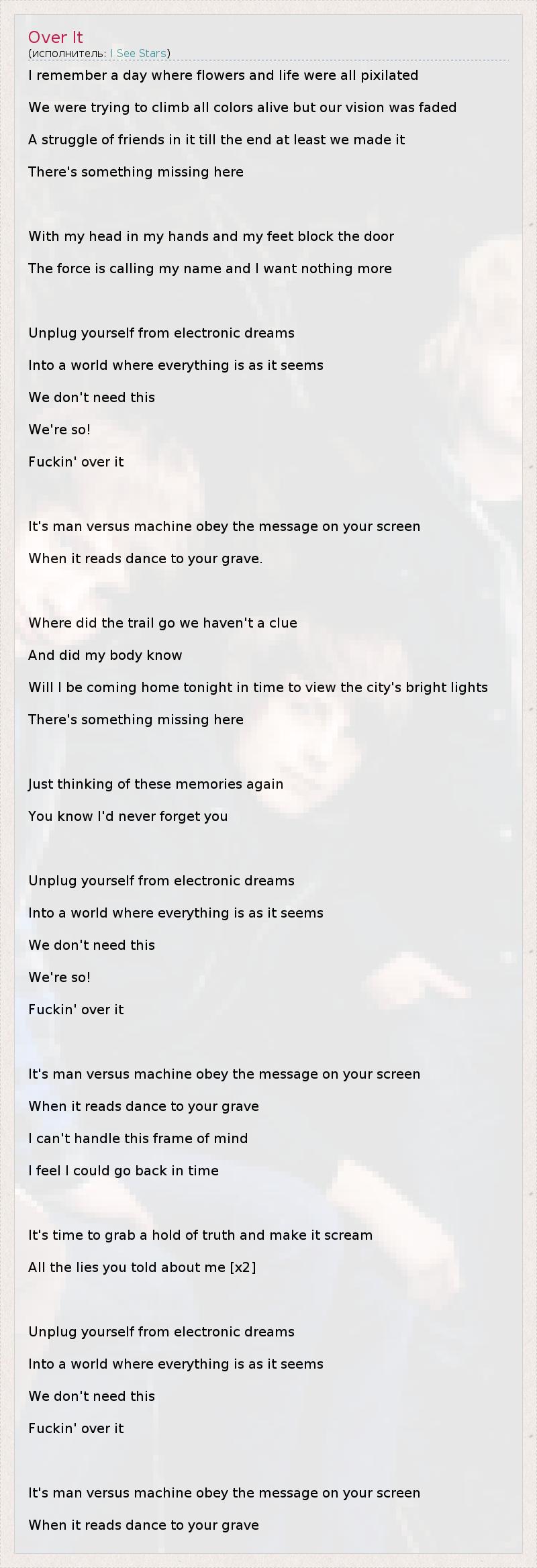 I remember a day where flowers and life were all pixilated We were trying to climb all colors alive but our vision was faded A struggle of friends in it till the end at least we made it There's something missing here With my head in my hands and my feet block the door The force is calling my name and I want nothing more Unplug yourself from electronic dreams Into a world where everything is as it seems We don't need this We're so! Fuckin' over it It's man versus machine obey the message on your screen When it reads dance to your grave. Where did the trail go we haven't a clue And did my body know Will I be coming home tonight in time to view the city's bright lights There's something missing here Just thinking of these memories again You know I'd never forget you Unplug yourself from electronic dreams Into a world where everything is as it seems We don't need this We're so! Fuckin' over it It's man versus machine obey the message on your screen When it reads dance to your grave I can't handle this frame of mind I feel I could go back in time It's time to grab a hold of truth and make it scream All the lies you told about me [x2] Unplug yourself from electronic dreams Into a world where everything is as it seems We don't need this Fuckin' over it It's man versus machine obey the message on your screen When it reads dance to your grave