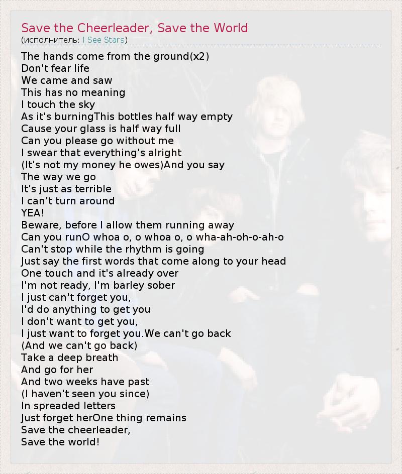 The hands come from the ground(x2) Don't fear life We came and saw This has no meaning I touch the sky As it's burningThis bottles half way empty Cause your glass is half way full Can you please go without me I swear that everything's alright (It's not my money he owes)And you say The way we go It's just as terrible I can't turn around YEA! Beware, before I allow them running away Can you runO whoa o, o whoa o, o wha-ah-oh-o-ah-o Can't stop while the rhythm is going Just say the first words that come along to your head One touch and it's already over I'm not ready, I'm barley sober I just can't forget you, I'd do anything to get you I don't want to get you, I just want to forget you.We can't go back (And we can't go back) Take a deep breath And go for her And two weeks have past (I haven't seen you since) In spreaded letters Just forget herOne thing remains Save the cheerleader, Save the world!