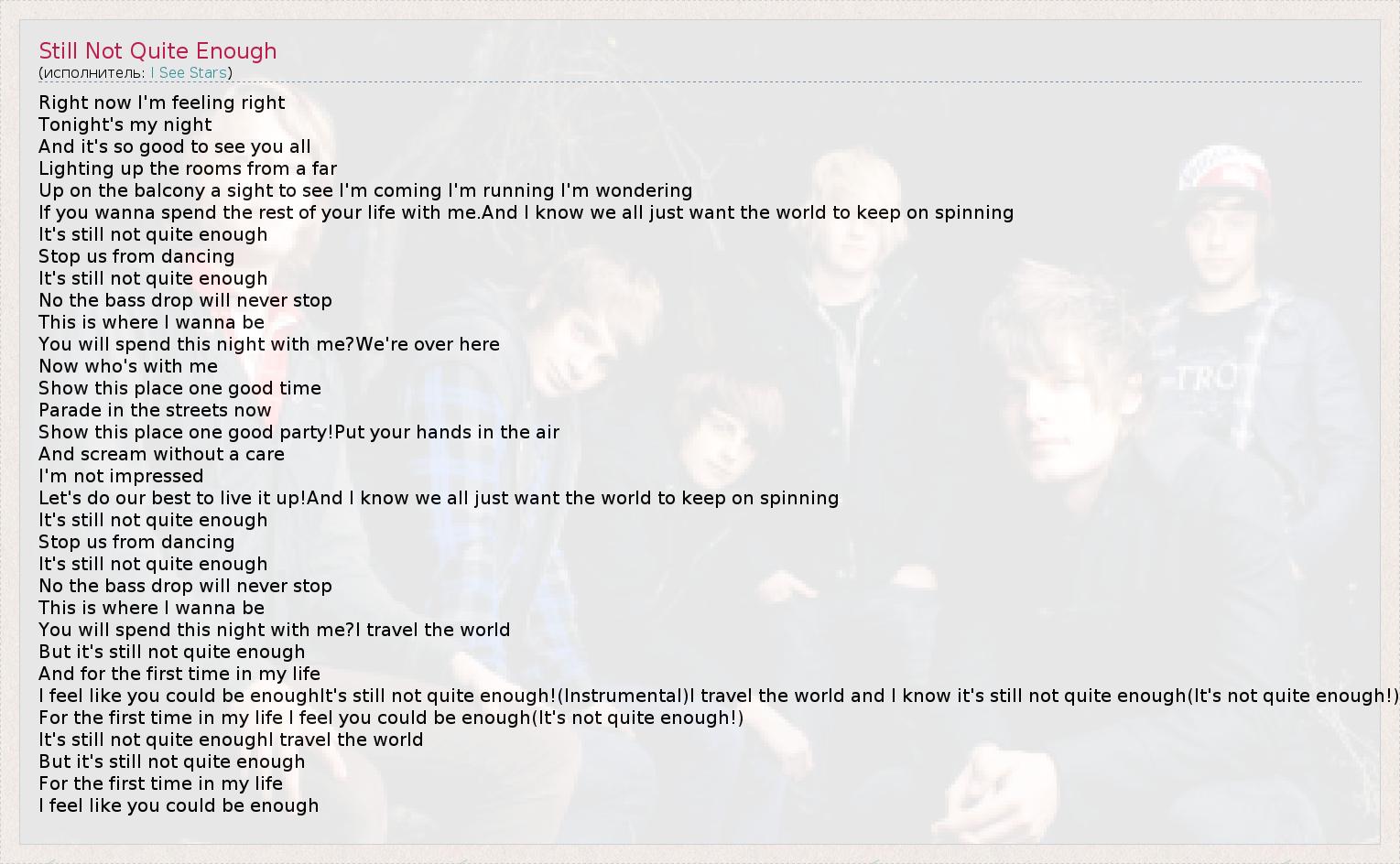 Right now I'm feeling right Tonight's my night And it's so good to see you all Lighting up the rooms from a far Up on the balcony a sight to see I'm coming I'm running I'm wondering If you wanna spend the rest of your life with me.And I know we all just want the world to keep on spinning It's still not quite enough Stop us from dancing It's still not quite enough No the bass drop will never stop This is where I wanna be You will spend this night with me?We're over here Now who's with me Show this place one good time Parade in the streets now Show this place one good party!Put your hands in the air And scream without a care I'm not impressed Let's do our best to live it up!And I know we all just want the world to keep on spinning It's still not quite enough Stop us from dancing It's still not quite enough No the bass drop will never stop This is where I wanna be You will spend this night with me?I travel the world But it's still not quite enough And for the first time in my life I feel like you could be enoughIt's still not quite enough!(Instrumental)I travel the world and I know it's still not quite enough(It's not quite enough!) For the first time in my life I feel you could be enough(It's not quite enough!) It's still not quite enoughI travel the world But it's still not quite enough For the first time in my life I feel like you could be enough