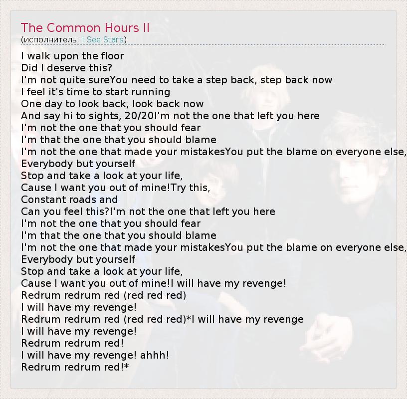 I walk upon the floor Did I deserve this? I'm not quite sureYou need to take a step back, step back now I feel it's time to start running One day to look back, look back now And say hi to sights, 20/20I'm not the one that left you here I'm not the one that you should fear I'm that the one that you should blame I'm not the one that made your mistakesYou put the blame on everyone else, Everybody but yourself Stop and take a look at your life, Cause I want you out of mine!Try this, Constant roads and Can you feel this?I'm not the one that left you here I'm not the one that you should fear I'm that the one that you should blame I'm not the one that made your mistakesYou put the blame on everyone else, Everybody but yourself Stop and take a look at your life, Cause I want you out of mine!I will have my revenge! Redrum redrum red (red red red) I will have my revenge! Redrum redrum red (red red red)*I will have my revenge I will have my revenge! Redrum redrum red! I will have my revenge! ahhh! Redrum redrum red!*