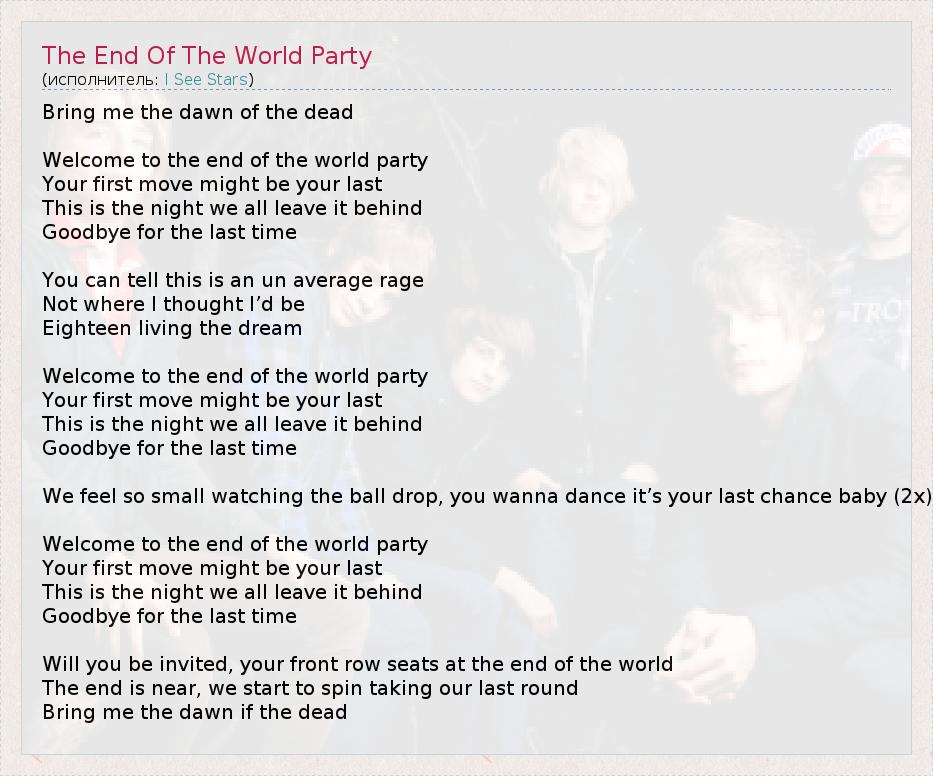 Bring me the dawn of the dead Welcome to the end of the world party Your first move might be your last This is the night we all leave it behind Goodbye for the last time You can tell this is an un average rage Not where I thought I’d be Eighteen living the dream Welcome to the end of the world party Your first move might be your last This is the night we all leave it behind Goodbye for the last time We feel so small watching the ball drop, you wanna dance it’s your last chance baby (2x) Welcome to the end of the world party Your first move might be your last This is the night we all leave it behind Goodbye for the last time Will you be invited, your front row seats at the end of the world The end is near, we start to spin taking our last round Bring me the dawn if the dead