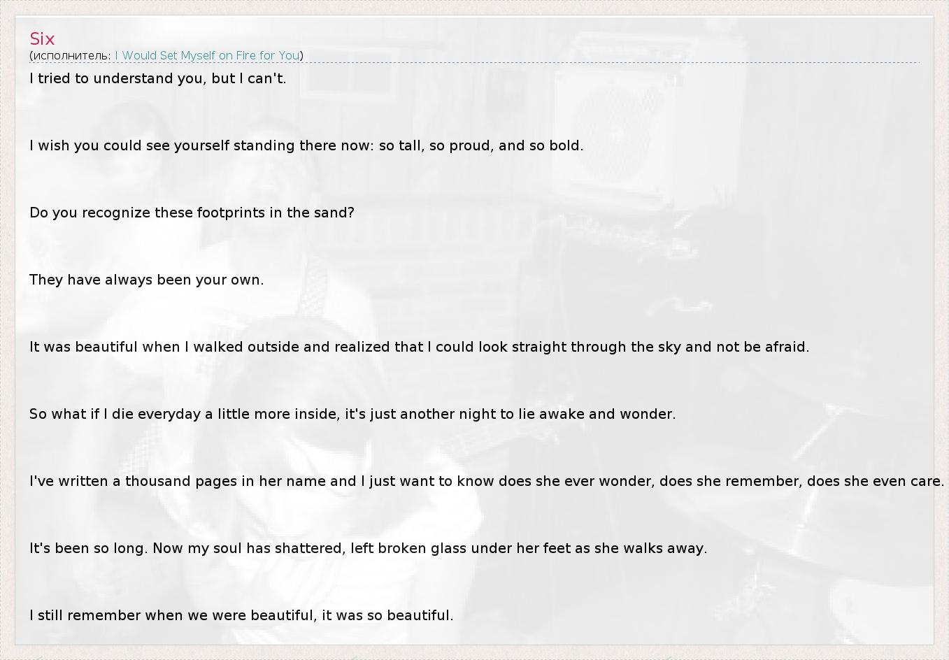 Это интересно:I Would Set Myself on Fire for You - скримо-команда из города Атланта, штат Джорджия, США. Образовавшись в 2001 году первоначальным составом являлись: Джастин (бас, вокал), Линдси (альт скрипичный, вокал), Стивен (гитара, вокал), Пол (ударные). Они играли художественную и драматичную музыку с тремя вокалистами. В 2007 на MySpace группы было опубликовано сообщение о... продолжение