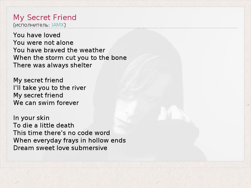 You have loved You were not alone You have braved the weather When the storm cut you to the bone There was always shelter My secret friend I'll take you to the river My secret friend We can swim forever In your skin To die a little death This time there's no code word When everyday frays in hollow ends Dream sweet love submersive