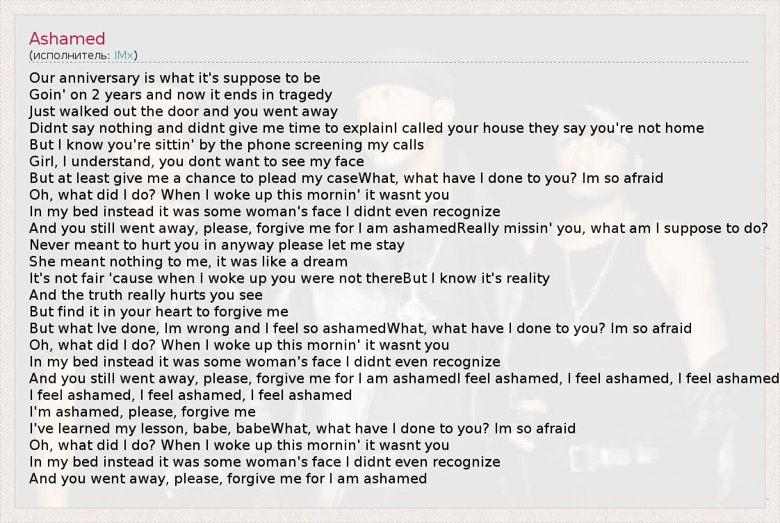 Our anniversary is what it's suppose to be Goin' on 2 years and now it ends in tragedy Just walked out the door and you went away Didnt say nothing and didnt give me time to explainI called your house they say you're not home But I know you're sittin' by the phone screening my calls Girl, I understand, you dont want to see my face But at least give me a chance to plead my caseWhat, what have I done to you? Im so afraid Oh, what did I do? When I woke up this mornin' it wasnt you In my bed instead it was some woman's face I didnt even recognize And you still went away, please, forgive me for I am ashamedReally missin' you, what am I suppose to do? Never meant to hurt you in anyway please let me stay She meant nothing to me, it was like a dream It's not fair 'cause when I woke up you were not thereBut I know it's reality And the truth really hurts you see But find it in your heart to forgive me But what Ive done, Im wrong and I feel so ashamedWhat, what have I done to you? Im so afraid Oh, what did I do? When I woke up this mornin' it wasnt you In my bed instead it was some woman's face I didnt even recognize And you still went away, please, forgive me for I am ashamedI feel ashamed, I feel ashamed, I feel ashamed I feel ashamed, I feel ashamed, I feel ashamed I'm ashamed, please, forgive me I've learned my lesson, babe, babeWhat, what have I done to you? Im so afraid Oh, what did I do? When I woke up this mornin' it wasnt you In my bed instead it was some woman's face I didnt even recognize And you went away, please, forgive me for I am ashamed