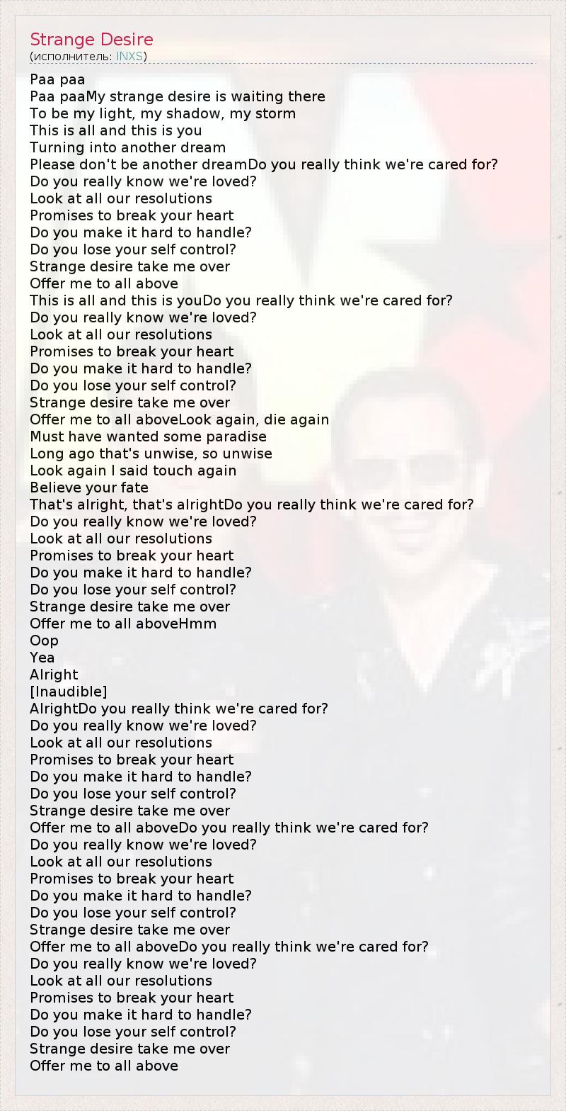 Paa paa Paa paaMy strange desire is waiting there To be my light, my shadow, my storm This is all and this is you Turning into another dream Please don't be another dreamDo you really think we're cared for? Do you really know we're loved? Look at all our resolutions Promises to break your heart Do you make it hard to handle? Do you lose your self control? Strange desire take me over Offer me to all above This is all and this is youDo you really think we're cared for? Do you really know we're loved? Look at all our resolutions Promises to break your heart Do you make it hard to handle? Do you lose your self control? Strange desire take me over Offer me to all aboveLook again, die again Must have wanted some paradise Long ago that's unwise, so unwise Look again I said touch again Believe your fate That's alright, that's alrightDo you really think we're cared for? Do you really know we're loved? Look at all our resolutions Promises to break your heart Do you make it hard to handle? Do you lose your self control? Strange desire take me over Offer me to all aboveHmm Oop Yea Alright [Inaudible] AlrightDo you really think we're cared for? Do you really know we're loved? Look at all our resolutions Promises to break your heart Do you make it hard to handle? Do you lose your self control? Strange desire take me over Offer me to all aboveDo you really think we're cared for? Do you really know we're loved? Look at all our resolutions Promises to break your heart Do you make it hard to handle? Do you lose your self control? Strange desire take me over Offer me to all aboveDo you really think we're cared for? Do you really know we're loved? Look at all our resolutions Promises to break your heart Do you make it hard to handle? Do you lose your self control? Strange desire take me over Offer me to all above