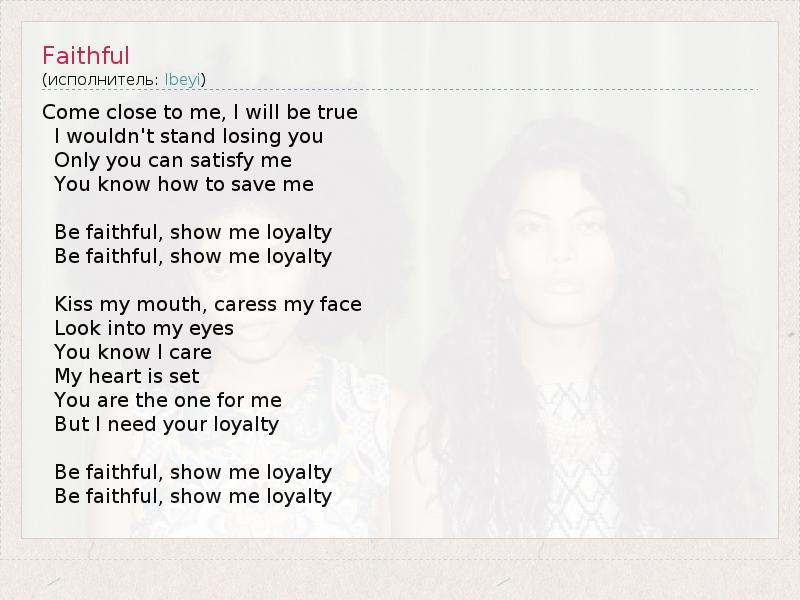 Come close to me, I will be true I wouldn't stand losing you Only you can satisfy me You know how to save me Be faithful, show me loyalty Be faithful, show me loyalty Kiss my mouth, caress my face Look into my eyes You know I care My heart is set You are the one for me But I need your loyalty Be faithful, show me loyalty Be faithful, show me loyalty