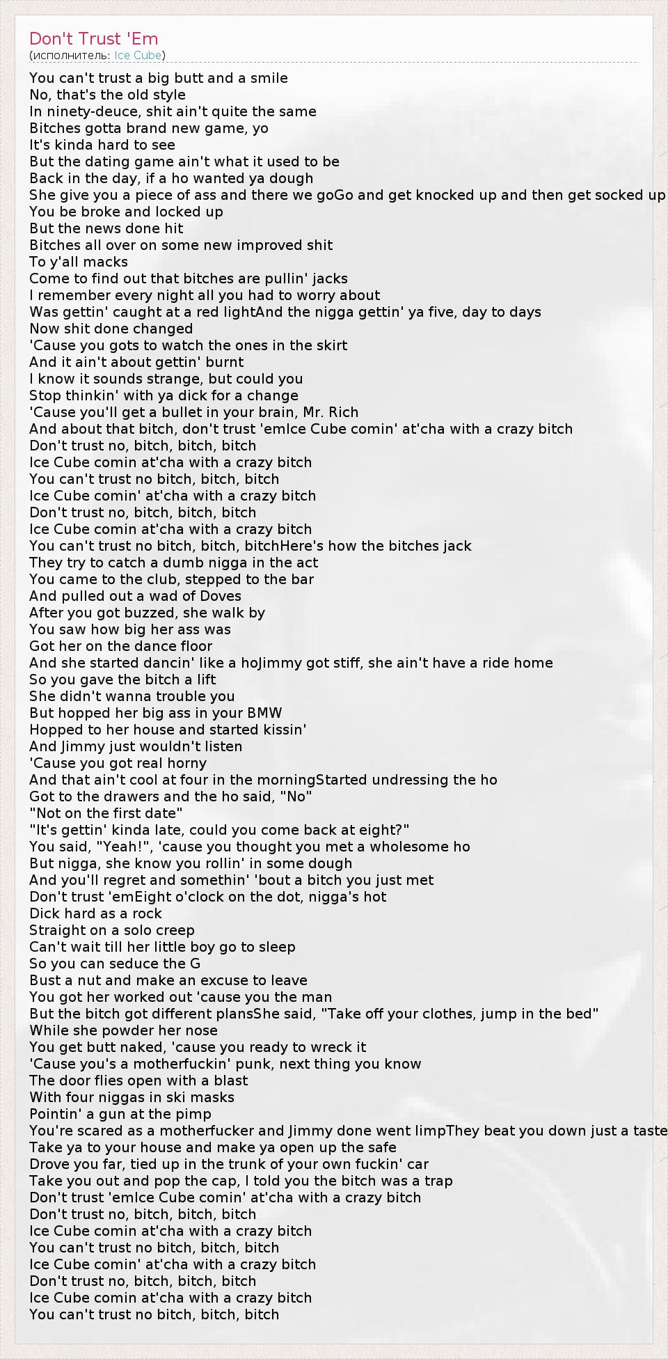 You can't trust a big butt and a smile No, that's the old style In ninety-deuce, shit ain't quite the same Bitches gotta brand new game, yo It's kinda hard to see But the dating game ain't what it used to be Back in the day, if a ho wanted ya dough She give you a piece of ass and there we goGo and get knocked up and then get socked up You be broke and locked up But the news done hit Bitches all over on some new improved shit To y'all macks Come to find out that bitches are pullin' jacks I remember every night all you had to worry about Was gettin' caught at a red lightAnd the nigga gettin' ya five, day to days Now shit done changed 'Cause you gots to watch the ones in the skirt And it ain't about gettin' burnt I know it sounds strange, but could you Stop thinkin' with ya dick for a change 'Cause you'll get a bullet in your brain, Mr. Rich And about that bitch, don't trust 'emIce Cube comin' at'cha with a crazy bitch Don't trust no, bitch, bitch, bitch Ice Cube comin at'cha with a crazy bitch You can't trust no bitch, bitch, bitch Ice Cube comin' at'cha with a crazy bitch Don't trust no, bitch, bitch, bitch Ice Cube comin at'cha with a crazy bitch You can't trust no bitch, bitch, bitchHere's how the bitches jack They try to catch a dumb nigga in the act You came to the club, stepped to the bar And pulled out a wad of Doves After you got buzzed, she walk by You saw how big her ass was Got her on the dance floor And she started dancin' like a hoJimmy got stiff, she ain't have a ride home So you gave the bitch a lift She didn't wanna trouble you But hopped her big ass in your BMW Hopped to her house and started kissin' And Jimmy just wouldn't listen 'Cause you got real horny And that ain't cool at four in the morningStarted undressing the ho Got to the drawers and the ho said, "No" "Not on the first date" "It's gettin' kinda late, could you come back at eight?" You said, "Yeah!", 'cause you thought you met a wholesome ho But nigga, she know you rollin' in some dough And you'll regret and somethin' 'bout a bitch you just met Don't trust 'emEight o'clock on the dot, nigga's hot Dick hard as a rock Straight on a solo creep Can't wait till her little boy go to sleep So you can seduce the G Bust a nut and make an excuse to leave You got her worked out 'cause you the man But the bitch got different plansShe said, "Take off your clothes, jump in the bed" While she powder her nose You get butt naked, 'cause you ready to wreck it 'Cause you's a motherfuckin' punk, next thing you know The door flies open with a blast With four niggas in ski masks Pointin' a gun at the pimp You're scared as a motherfucker and Jimmy done went limpThey beat you down just a taste Take ya to your house and make ya open up the safe Drove you far, tied up in the trunk of your own fuckin' car Take you out and pop the cap, I told you the bitch was a trap Don't trust 'emIce Cube comin' at'cha with a crazy bitch Don't trust no, bitch, bitch, bitch Ice Cube comin at'cha with a crazy bitch You can't trust no bitch, bitch, bitch Ice Cube comin' at'cha with a crazy bitch Don't trust no, bitch, bitch, bitch Ice Cube comin at'cha with a crazy bitch You can't trust no bitch, bitch, bitch