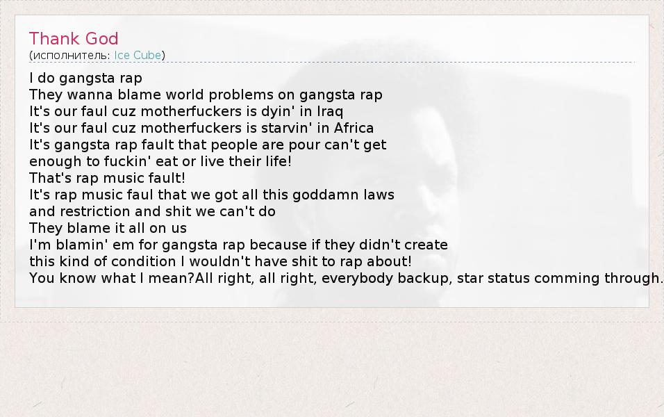 Это интересно:MC сейчас уделяют минимальное внимание социальным и политическим темам в своих произведениях. В наше время это менее востребовано, чем 10-15 лет назад, хоть и остается актуальным для некоторых артистов. Но во времена, когда серьезная социальная лирика была на вес золота и продавала многомиллионные тиражи пластинок, королем многие назвали бы именно Ice Cube, который, несмотря на высокую конкуренцию,... продолжение