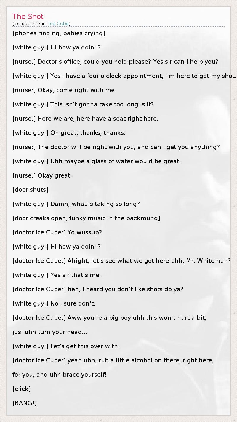 [doctor Ice Cube:] heh, I heard you don't like shots do ya?