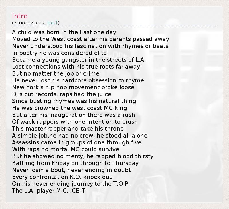 A child was born in the East one day Moved to the West coast after his parents passed away Never understood his fascination with rhymes or beats In poetry he was considered elite Became a young gangster in the streets of L.A. Lost connections with his true roots far away But no matter the job or crime He never lost his hardcore obsession to rhyme New York's hip hop movement broke loose DJ's cut records, raps had the juice Since busting rhymes was his natural thing He was crowned the west coast MC king But after his inauguration there was a rush Of wack rappers with one intention to crush This master rapper and take his throne A simple job,he had no crew, he stood all alone Assassins came in groups of one through five With raps no mortal MC could survive But he showed no mercy, he rapped blood thirsty Battling from Friday on through to Thursday Never losin a bout, never ending in doubt Every confrontation K.O. knock out On his never ending journey to the T.O.P. The L.A. player M.C. ICE-T