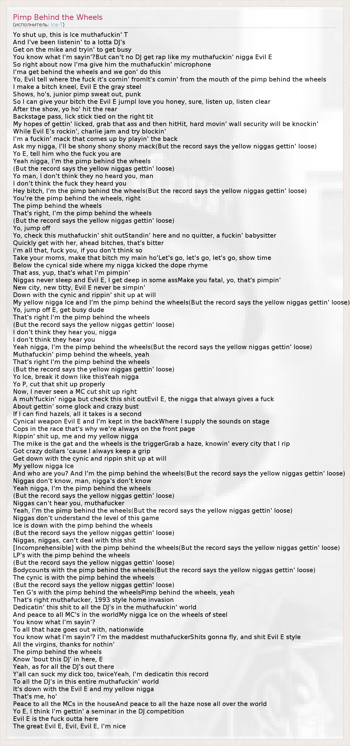 Hey bitch, I'm the pimp behind the wheels(But the record says the yellow niggas gettin' loose)