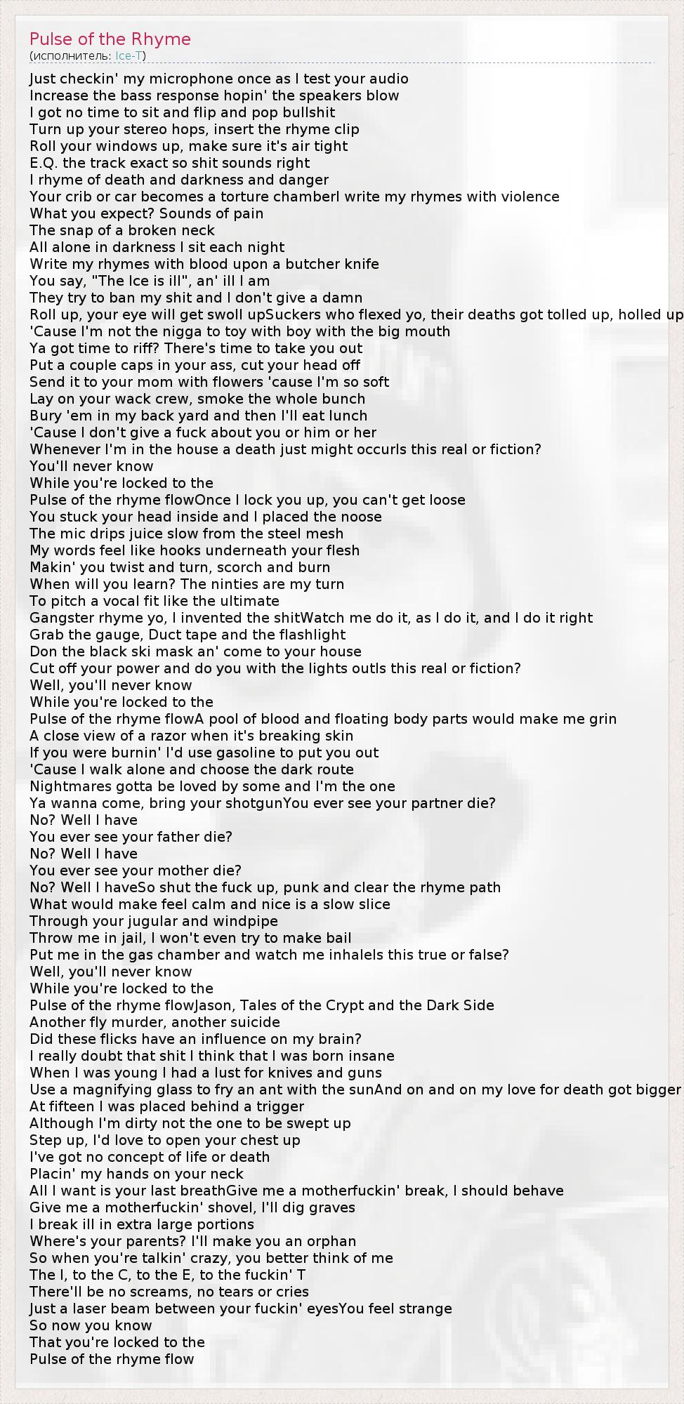 Pulse of the rhyme flowA pool of blood and floating body parts would make me grin
