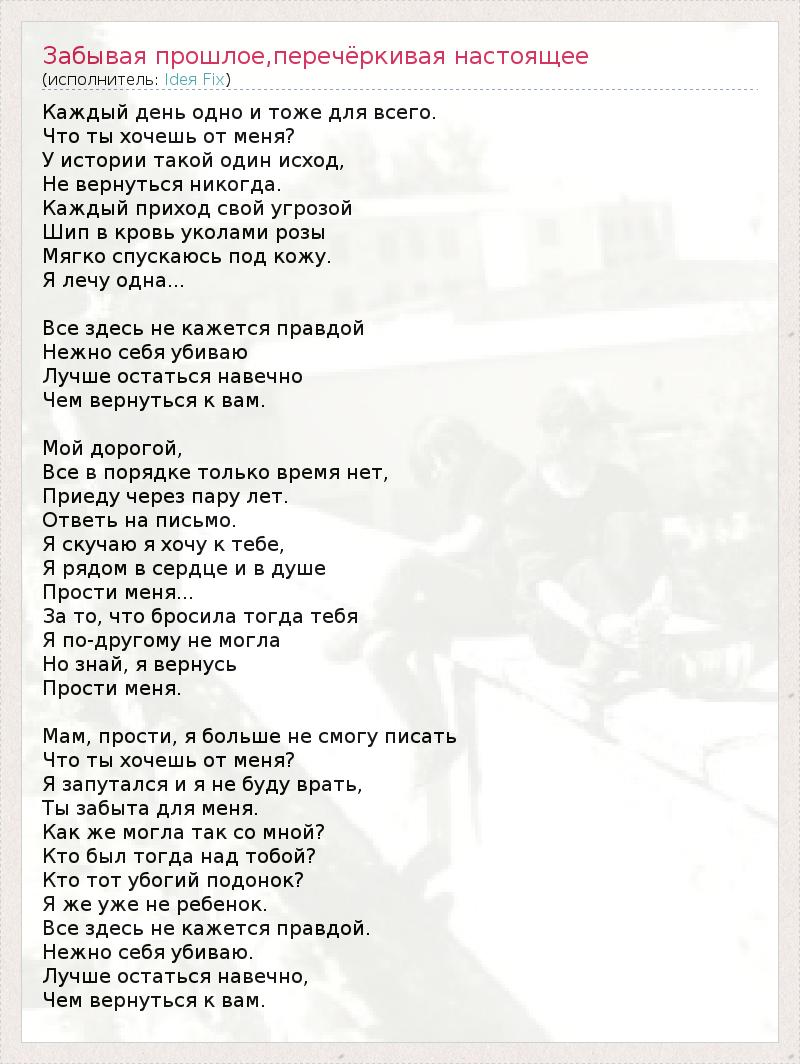 Каждый день одно и тоже для всего. Что ты хочешь от меня? У истории такой один исход, Не вернуться никогда. Каждый приход свой угрозой Шип в кровь уколами розы Мягко спускаюсь под кожу. Я лечу одна... Все здесь не кажется правдой Нежно себя убиваю Лучше остаться навечно Чем вернуться к вам. Мой дорогой, Все в порядке только время нет, Приеду через пару лет. Ответь на письмо. Я скучаю я хочу к тебе, Я рядом в сердце и в душе Прости меня... За то, что бросила тогда тебя Я по-другому не могла Но знай, я вернусь Прости меня. Мам, прости, я больше не смогу писать Что ты хочешь от меня? Я запутался и я не буду врать, Ты забыта для меня. Как же могла так со мной? Кто был тогда над тобой? Кто тот убогий подонок? Я же уже не ребенок. Все здесь не кажется правдой. Нежно себя убиваю. Лучше остаться навечно, Чем вернуться к вам.