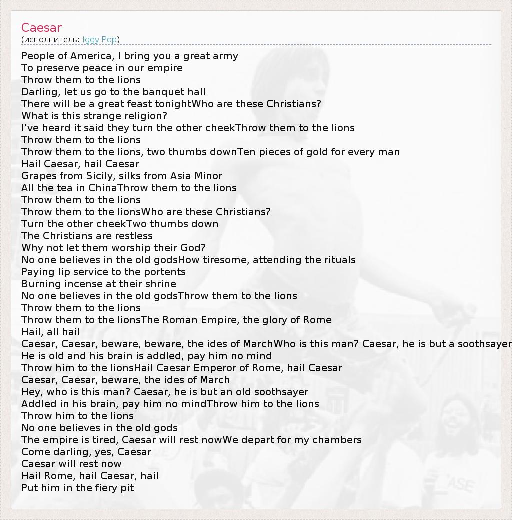 People of America, I bring you a great army To preserve peace in our empire Throw them to the lions Darling, let us go to the banquet hall There will be a great feast tonightWho are these Christians? What is this strange religion? I've heard it said they turn the other cheekThrow them to the lions Throw them to the lions Throw them to the lions, two thumbs downTen pieces of gold for every man Hail Caesar, hail Caesar Grapes from Sicily, silks from Asia Minor All the tea in ChinaThrow them to the lions Throw them to the lions Throw them to the lionsWho are these Christians? Turn the other cheekTwo thumbs down The Christians are restless Why not let them worship their God? No one believes in the old godsHow tiresome, attending the rituals Paying lip service to the portents Burning incense at their shrine No one believes in the old godsThrow them to the lions Throw them to the lions Throw them to the lionsThe Roman Empire, the glory of Rome Hail, all hail Caesar, Caesar, beware, beware, the ides of MarchWho is this man? Caesar, he is but a soothsayer He is old and his brain is addled, pay him no mind Throw him to the lionsHail Caesar Emperor of Rome, hail Caesar Caesar, Caesar, beware, the ides of March Hey, who is this man? Caesar, he is but an old soothsayer Addled in his brain, pay him no mindThrow him to the lions Throw him to the lions No one believes in the old gods The empire is tired, Caesar will rest nowWe depart for my chambers Come darling, yes, Caesar Caesar will rest now Hail Rome, hail Caesar, hail Put him in the fiery pit