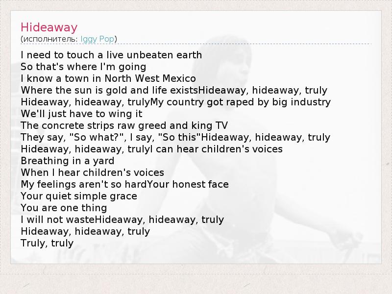 They say, "So what?", I say, "So this"Hideaway, hideaway, truly