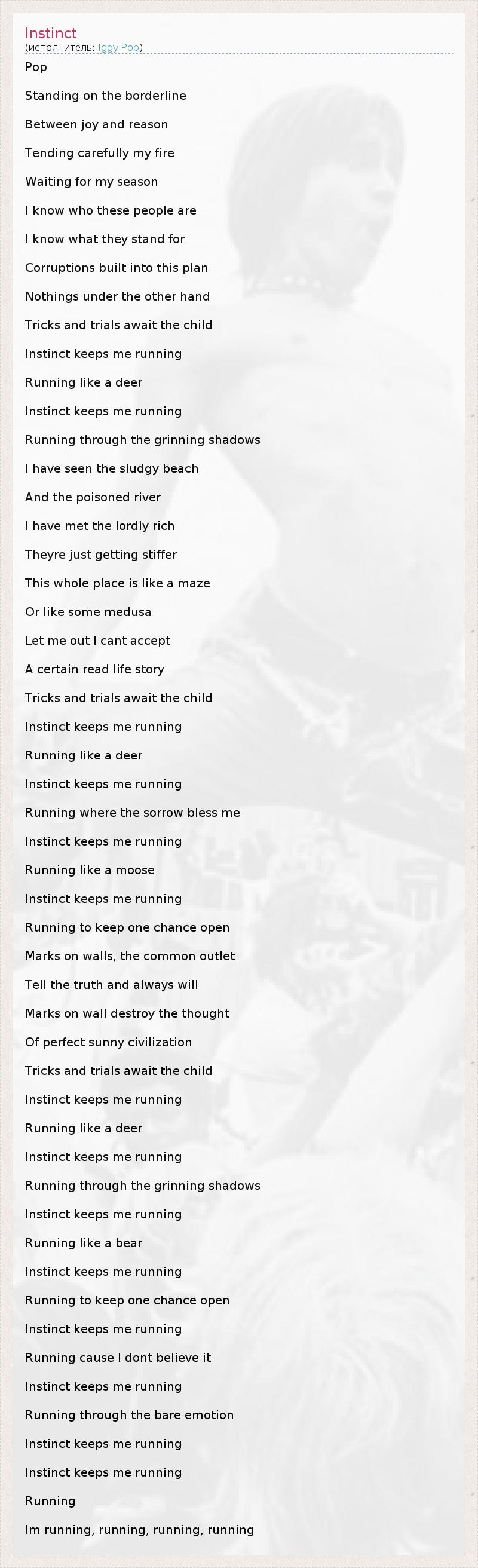 Pop Standing on the borderline Between joy and reason Tending carefully my fire Waiting for my season I know who these people are I know what they stand for Corruptions built into this plan Nothings under the other hand Tricks and trials await the child Instinct keeps me running Running like a deer Instinct keeps me running Running through the grinning shadows I have seen the sludgy beach And the poisoned river I have met the lordly rich Theyre just getting stiffer This whole place is like a maze Or like some medusa Let me out I cant accept A certain read life story Tricks and trials await the child Instinct keeps me running Running like a deer Instinct keeps me running Running where the sorrow bless me Instinct keeps me running Running like a moose Instinct keeps me running Running to keep one chance open Marks on walls, the common outlet Tell the truth and always will Marks on wall destroy the thought Of perfect sunny civilization Tricks and trials await the child Instinct keeps me running Running like a deer Instinct keeps me running Running through the grinning shadows Instinct keeps me running Running like a bear Instinct keeps me running Running to keep one chance open Instinct keeps me running Running cause I dont believe it Instinct keeps me running Running through the bare emotion Instinct keeps me running Instinct keeps me running Running Im running, running, running, running