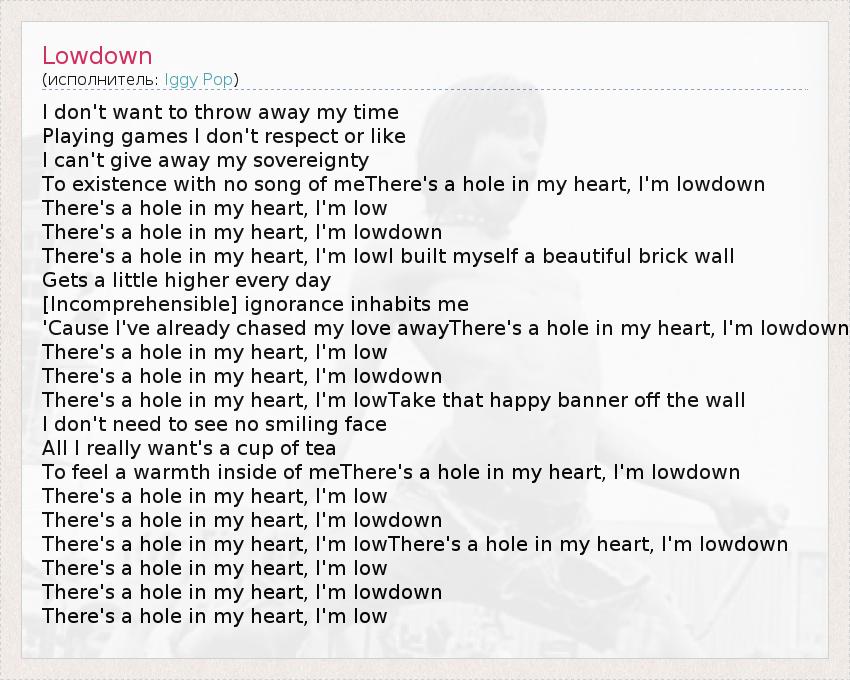 There's a hole in my heart, I'm lowThere's a hole in my heart, I'm lowdown