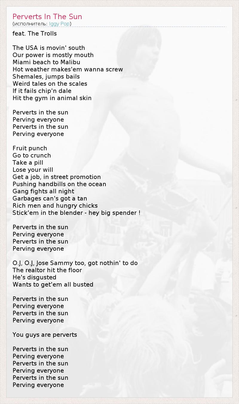 feat. The Trolls The USA is movin' south Our power is mostly mouth Miami beach to Malibu Hot weather makes'em wanna screw Shemales, jumps bails Weird tales on the scales If it fails chip'n dale Hit the gym in animal skin Perverts in the sun Perving everyone Perverts in the sun Perving everyone Fruit punch Go to crunch Take a pill Lose your will Get a job, in street promotion Pushing handbills on the ocean Gang fights all night Garbages can's got a tan Rich men and hungry chicks Stick'em in the blender - hey big spender ! Perverts in the sun Perving everyone Perverts in the sun Perving everyone O.J, O.J, Jose Sammy too, got nothin' to do The realtor hit the floor He's disgusted Wants to get'em all busted Perverts in the sun Perving everyone Perverts in the sun Perving everyone You guys are perverts Perverts in the sun Perving everyone Perverts in the sun Perving everyone Perverts in the sun Perving everyone