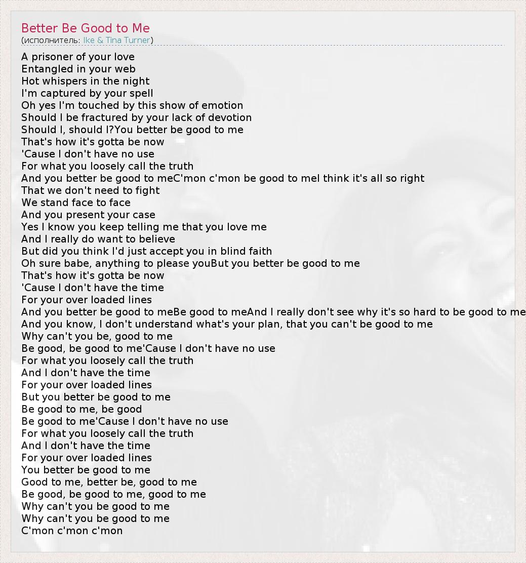 And you better be good to meBe good to meAnd I really don't see why it's so hard to be good to me