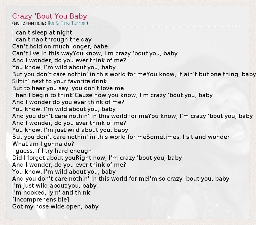 I can't sleep at night I can't nap through the day Can't hold on much longer, babe Can't live in this wayYou know, I'm crazy 'bout you, baby And I wonder, do you ever think of me? You know, I'm wild about you, baby But you don't care nothin' in this world for meYou know, it ain't but one thing, baby Sittin' next to your favorite drink But to hear you say, you don't love me Then I begin to think'Cause now you know, I'm crazy 'bout you, baby And I wonder do you ever think of me? You know, I'm wild about you, baby And you don't care nothin' in this world for meYou know, I'm crazy 'bout you, baby And I wonder, do you ever think of me? You know, I'm just wild about you, baby But you don't care nothin' in this world for meSometimes, I sit and wonder What am I gonna do? I guess, if I try hard enough Did I forget about youRight now, I'm crazy 'bout you, baby And I wonder, do you ever think of me? You know, I'm wild about you, baby And you don't care nothin' in this world for meI'm so crazy 'bout you, baby I'm just wild about you, baby I'm hooked, lyin' and think [Incomprehensible] Got my nose wide open, baby