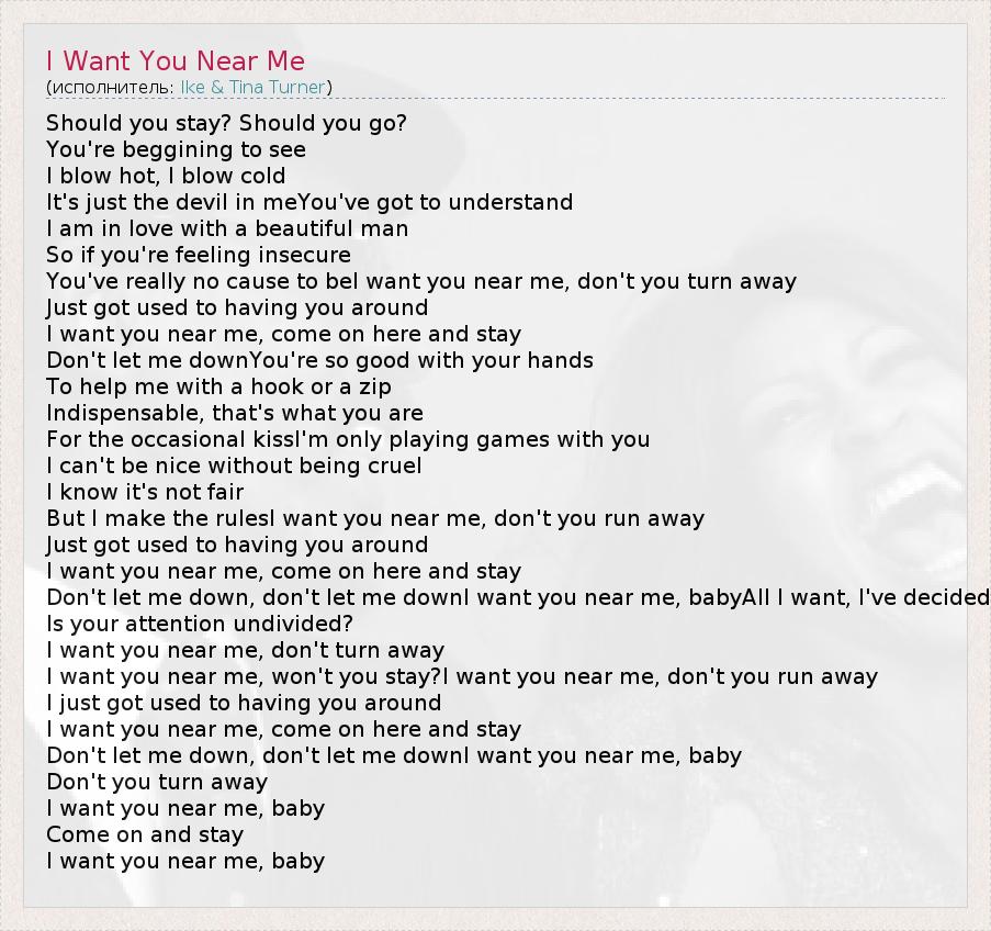Should you stay? Should you go? You're beggining to see I blow hot, I blow cold It's just the devil in meYou've got to understand I am in love with a beautiful man So if you're feeling insecure You've really no cause to beI want you near me, don't you turn away Just got used to having you around I want you near me, come on here and stay Don't let me downYou're so good with your hands To help me with a hook or a zip Indispensable, that's what you are For the occasional kissI'm only playing games with you I can't be nice without being cruel I know it's not fair But I make the rulesI want you near me, don't you run away Just got used to having you around I want you near me, come on here and stay Don't let me down, don't let me downI want you near me, babyAll I want, I've decided Is your attention undivided? I want you near me, don't turn away I want you near me, won't you stay?I want you near me, don't you run away I just got used to having you around I want you near me, come on here and stay Don't let me down, don't let me downI want you near me, baby Don't you turn away I want you near me, baby Come on and stay I want you near me, baby