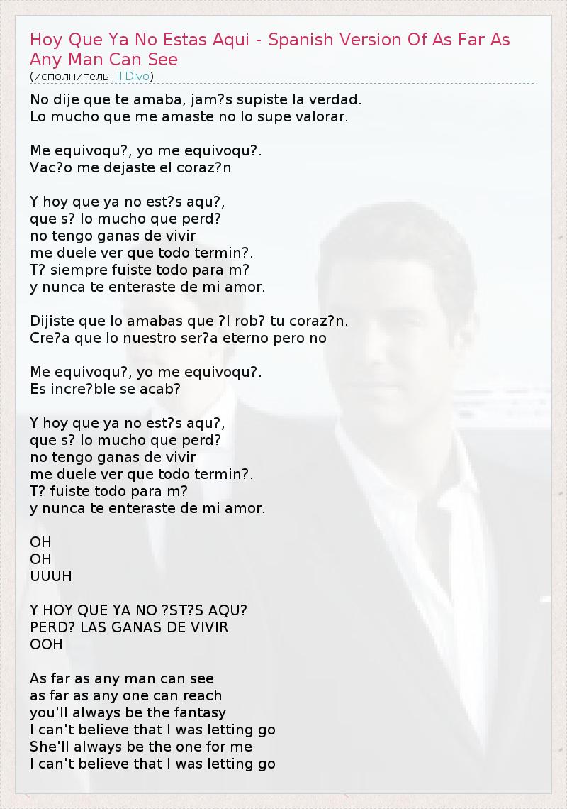 ГлавнаяИсполнителиIl DivoHoy Que Ya No Estas Aqui - Spanish Version Of As Far As Any Man Can See