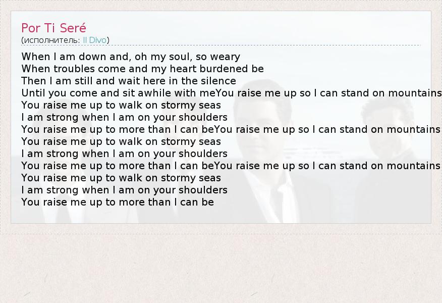 You raise me up to more than I can beYou raise me up so I can stand on mountains