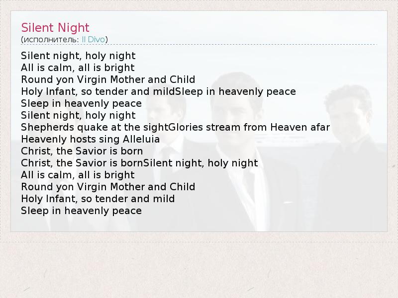 Silent night, holy night All is calm, all is bright Round yon Virgin Mother and Child Holy Infant, so tender and mildSleep in heavenly peace Sleep in heavenly peace Silent night, holy night Shepherds quake at the sightGlories stream from Heaven afar Heavenly hosts sing Alleluia Christ, the Savior is born Christ, the Savior is bornSilent night, holy night All is calm, all is bright Round yon Virgin Mother and Child Holy Infant, so tender and mild Sleep in heavenly peace